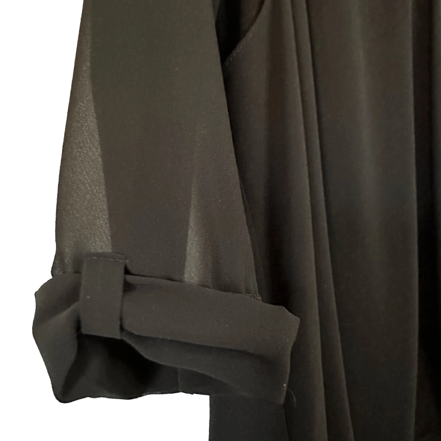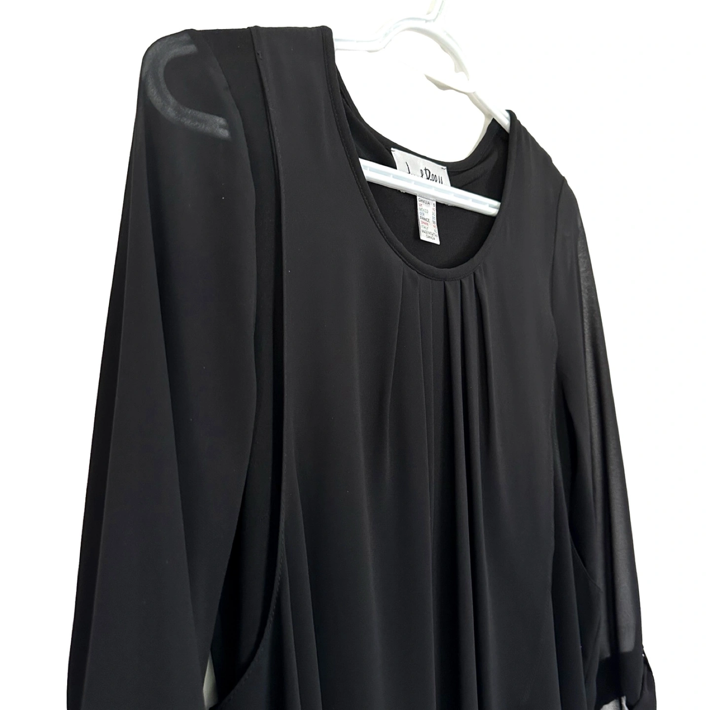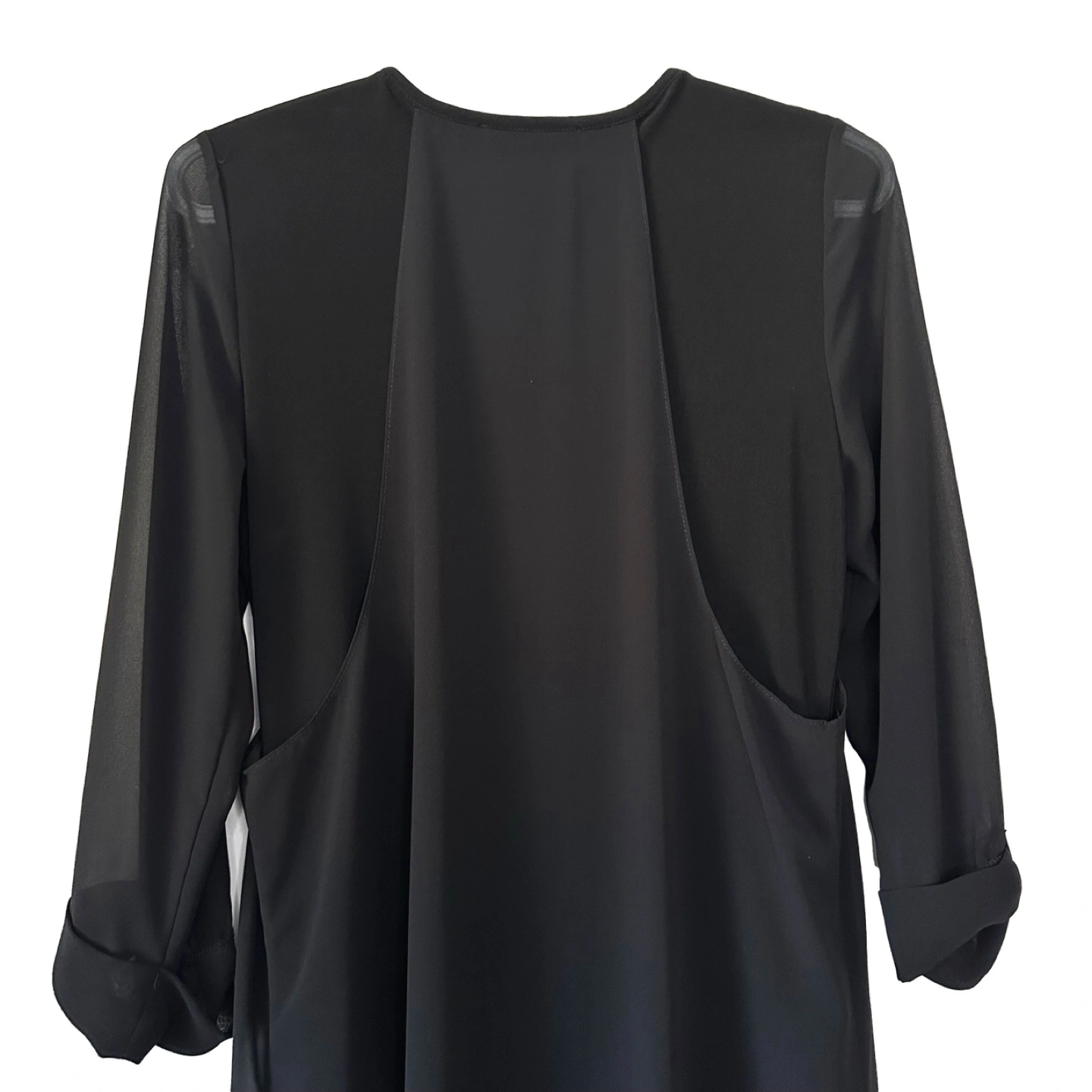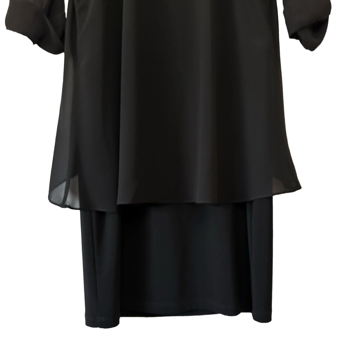 Elegant black dress. Features a layered design with sheer sleeves. Knee-length, perfect for various occasions. Three-quarter sleeves.