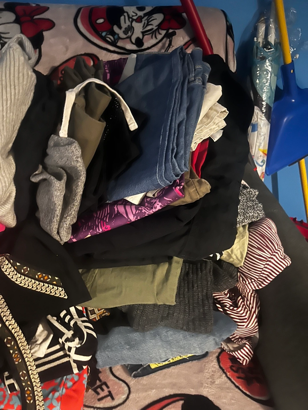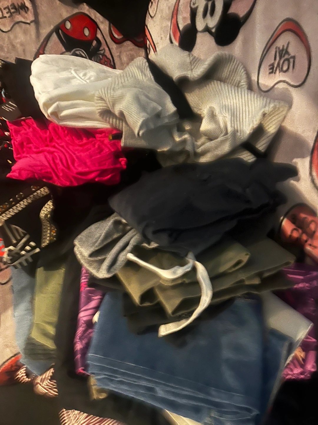 Large bundle of women's clothing. Includes tops, pants, and other items. Various colours and styles. Great for everyday wear.