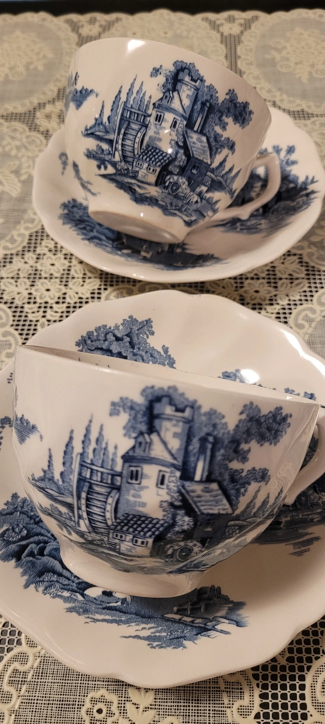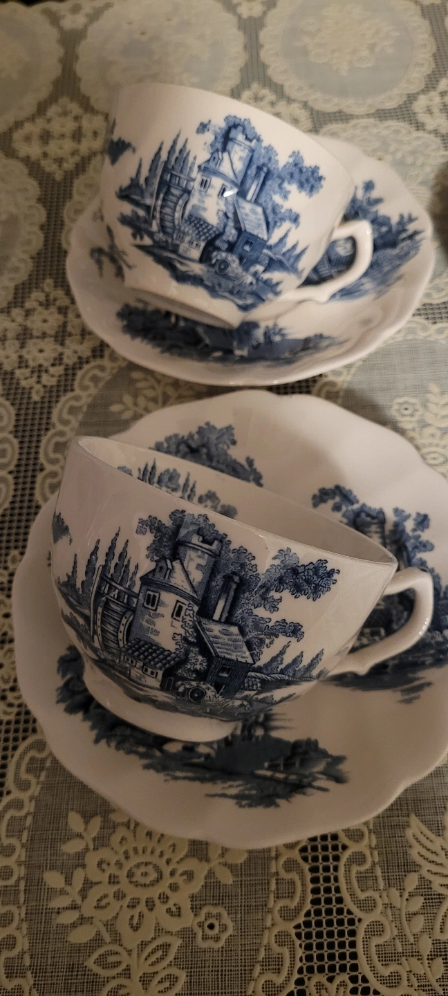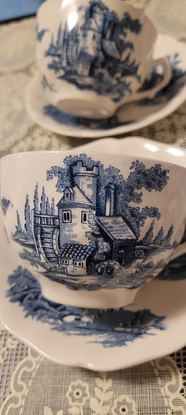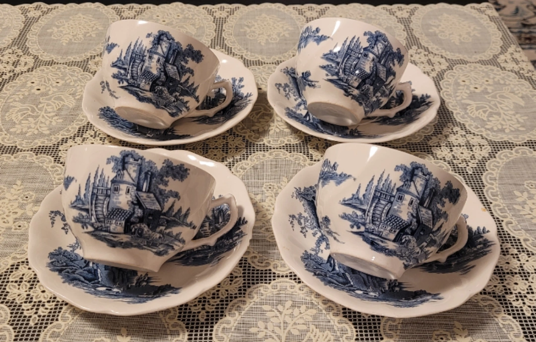 1000+Set of four teacups and saucers. Blue and white design. Made in England. 2 Minor chips on 2 of the saucers as per last 2 pictures. all 4 cups have no chips or cracks or crazing and 2 saucers have no chips or cracks or crazing. Yonge and Finch area