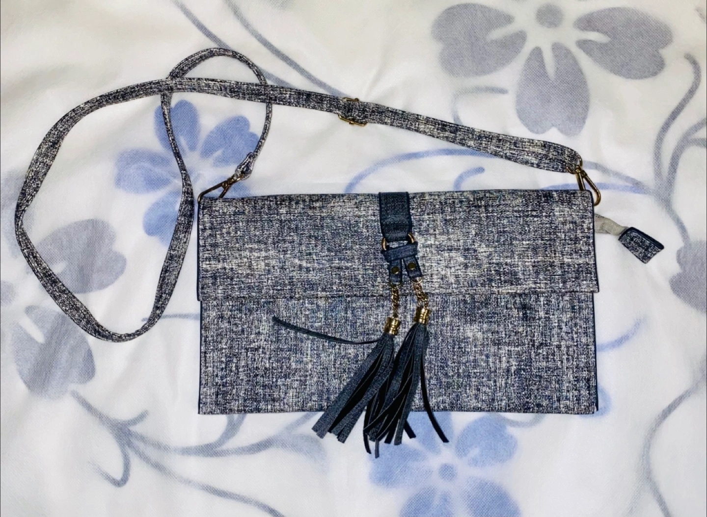 Stylish grey and black crossbody clutch. Features a textured fabric exterior, gold-toned hardware, and black tassels. Removable strap. Interior features multiple compartments. Perfect for evenings out.