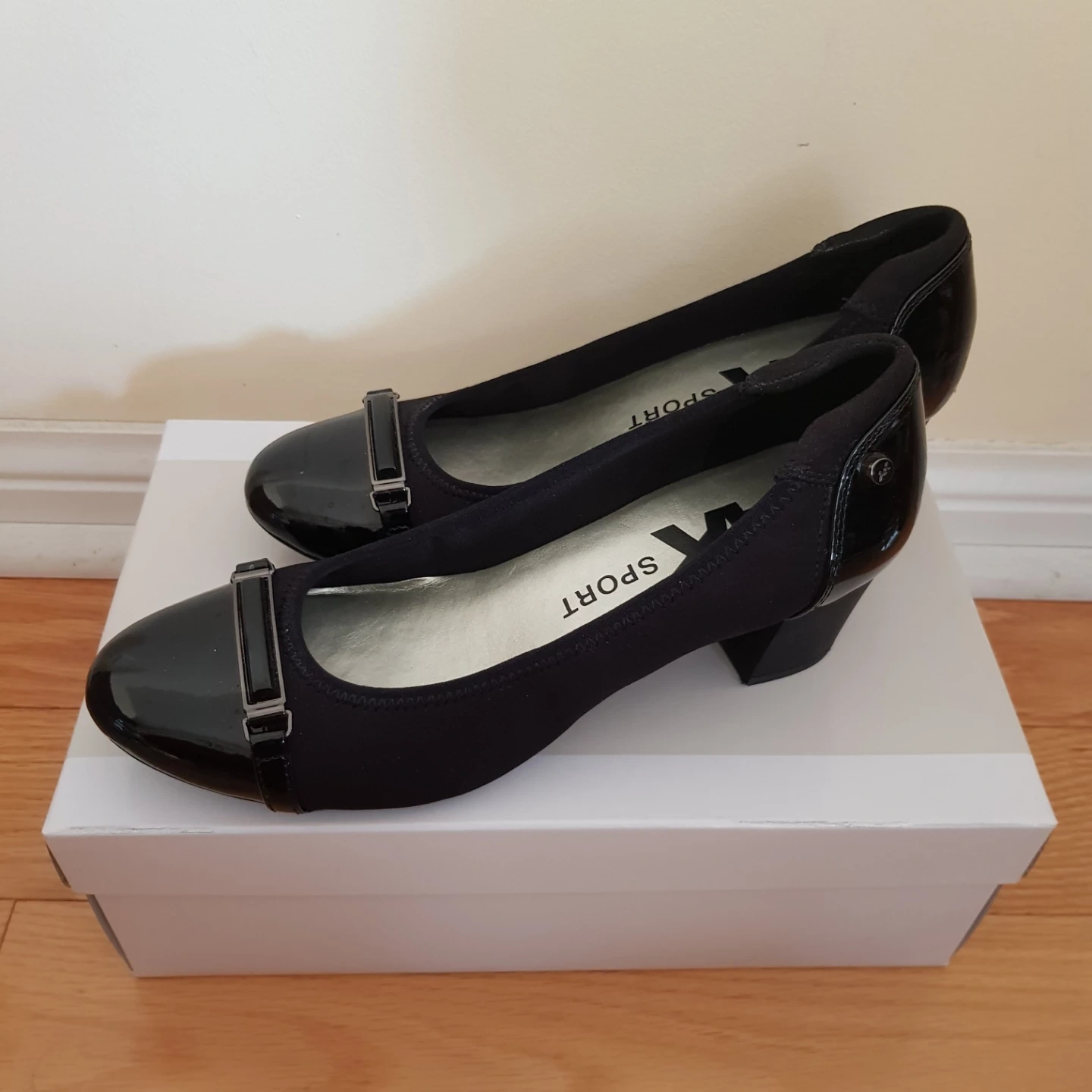 Black fabric and patent leather heels. Low 2 inch block heel. Size 6.5 medium (not wide). Worn on two occasions but found it was always digging into toes.