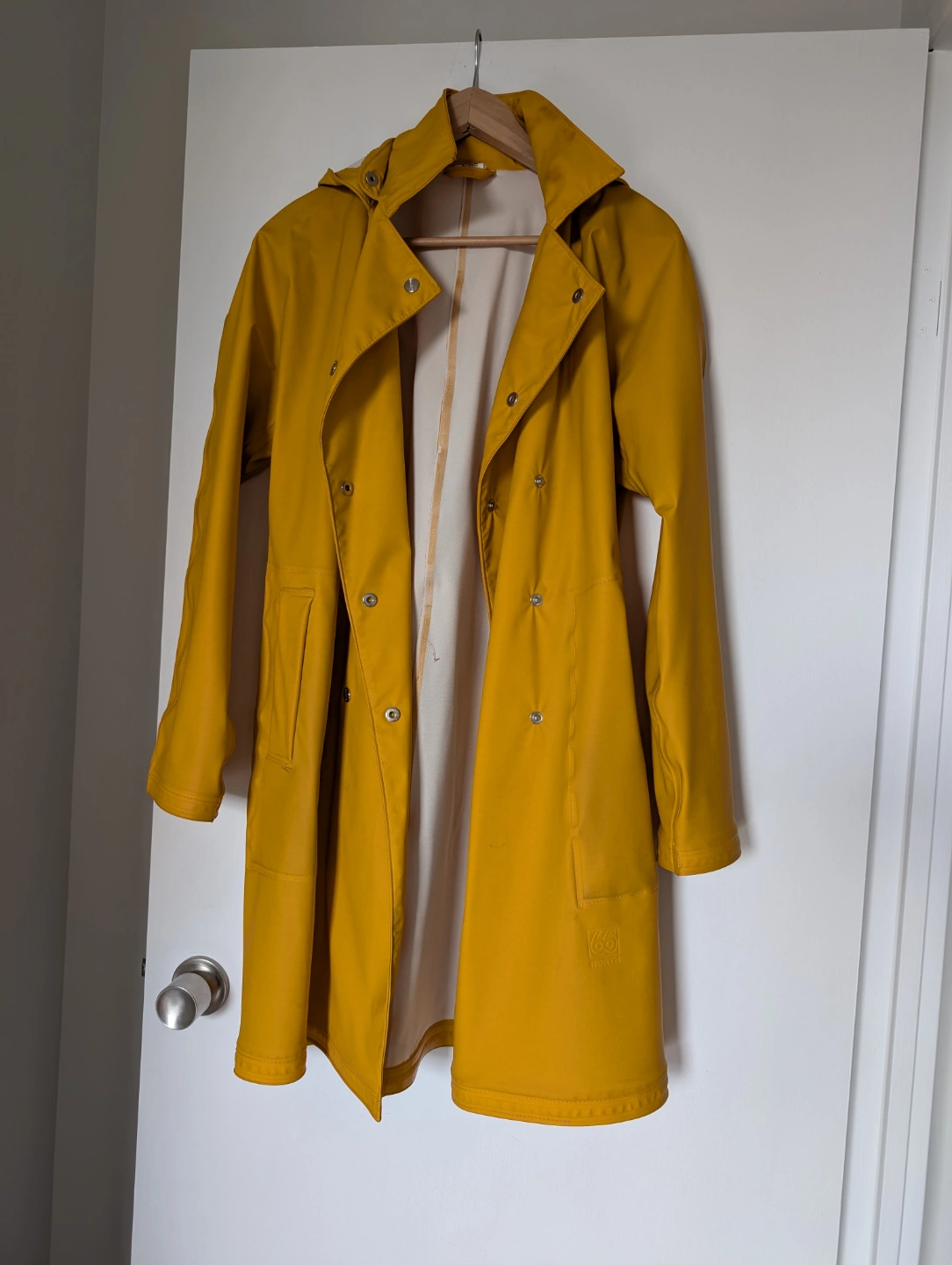 Yellow raincoat. Size medium, comfortable fit. Features a hood, side pockets and double-breasted closure. Made in Latvia. 55% polyamide, 45% polyurethane.