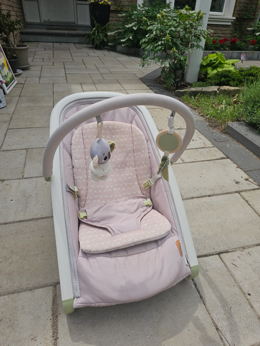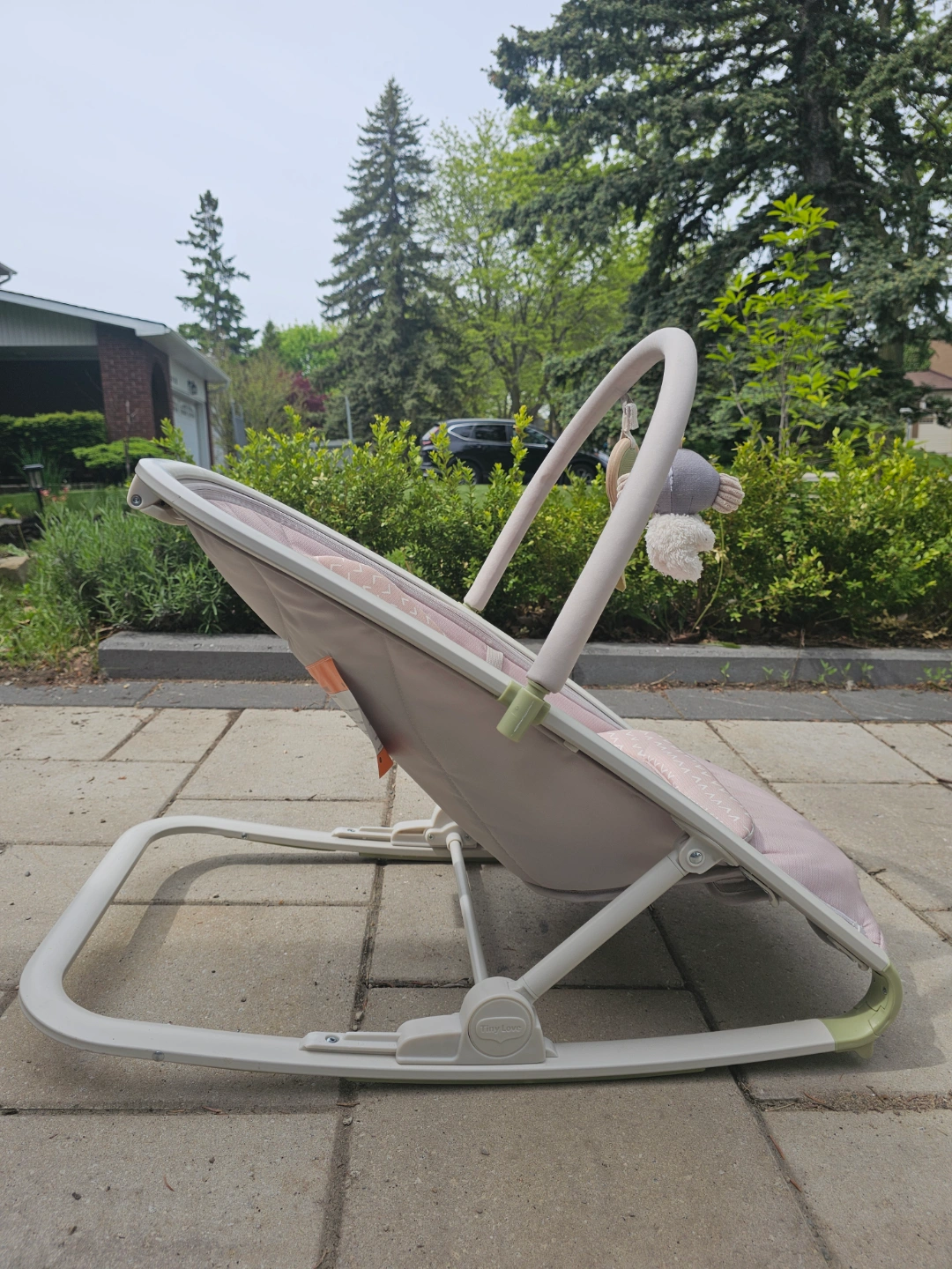 Lightly used baby rocker. Features a removable, machine washable fabric seat. Includes removable toy bar with hanging toys. Easy to fold and store. Gently used, excellent condition. Can be locked in place so it doesn't rock. Reclining back rest has 3 settings.