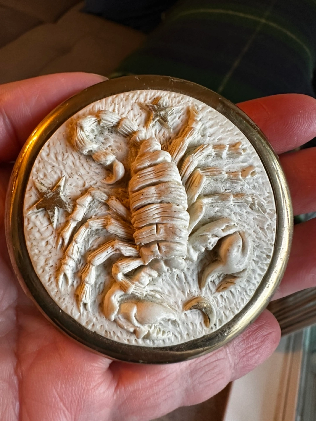 Unique vintage brass compact. Features a detailed sculpted Scorpio design. Solid brass construction. Made in England.