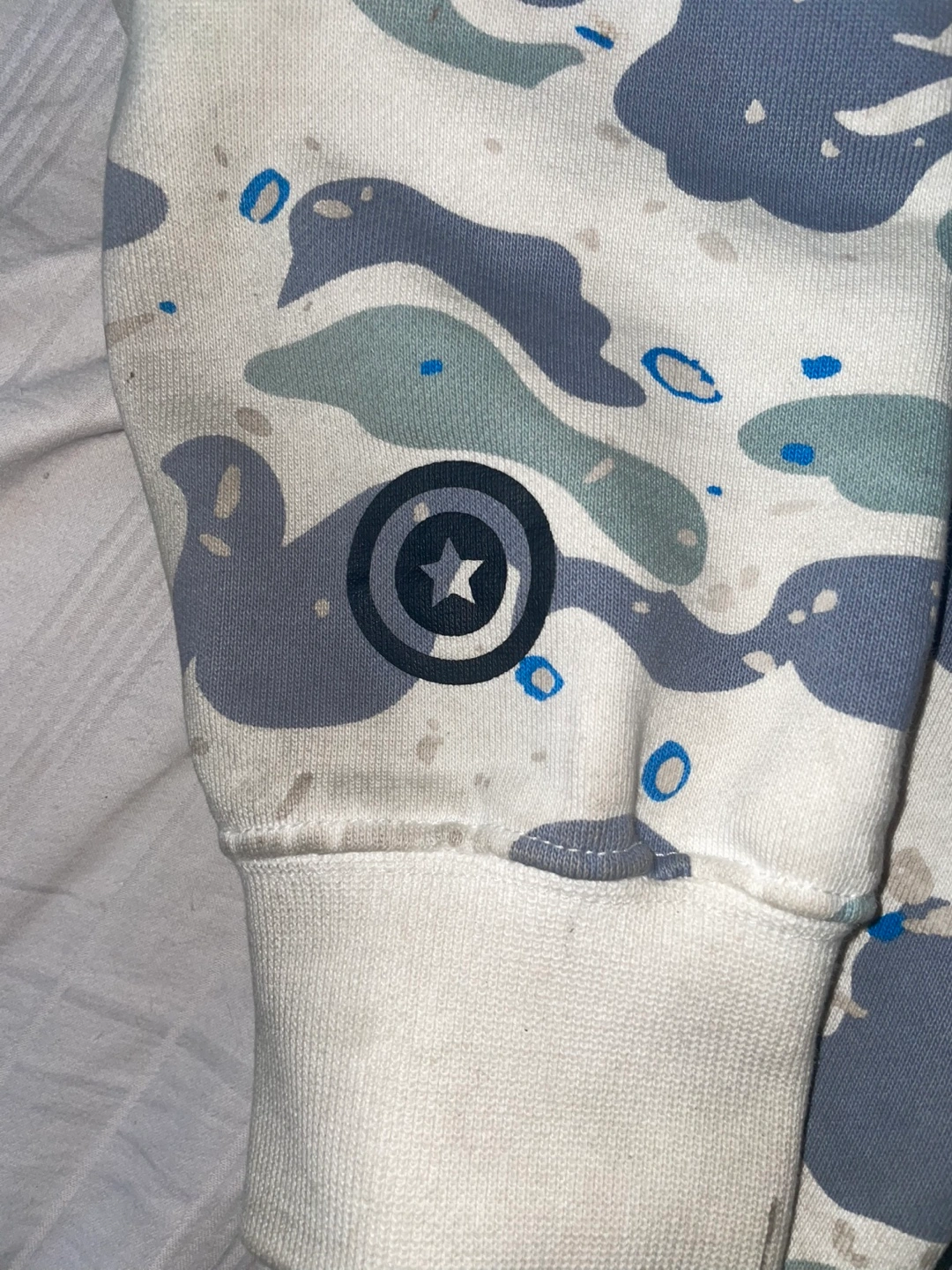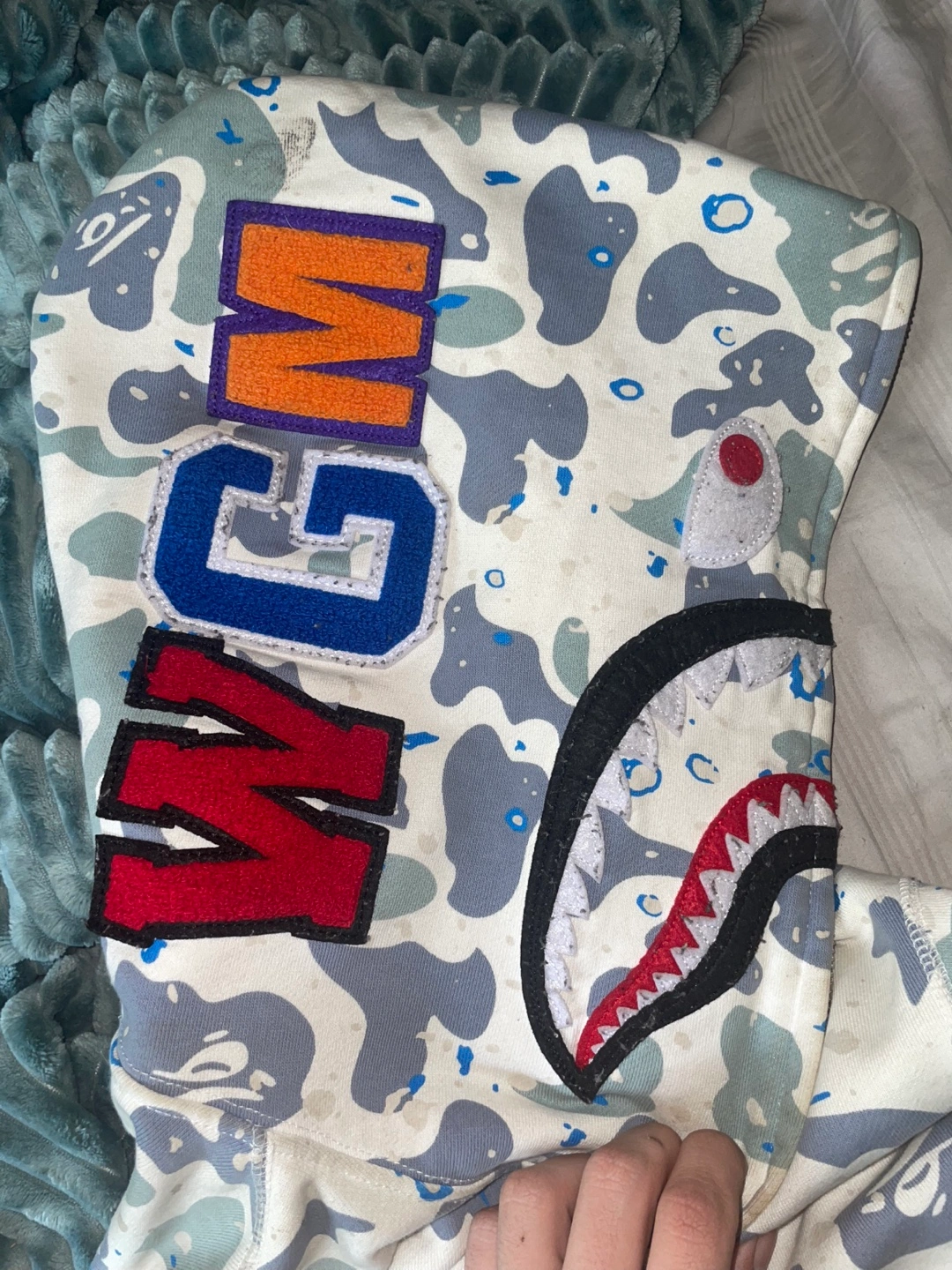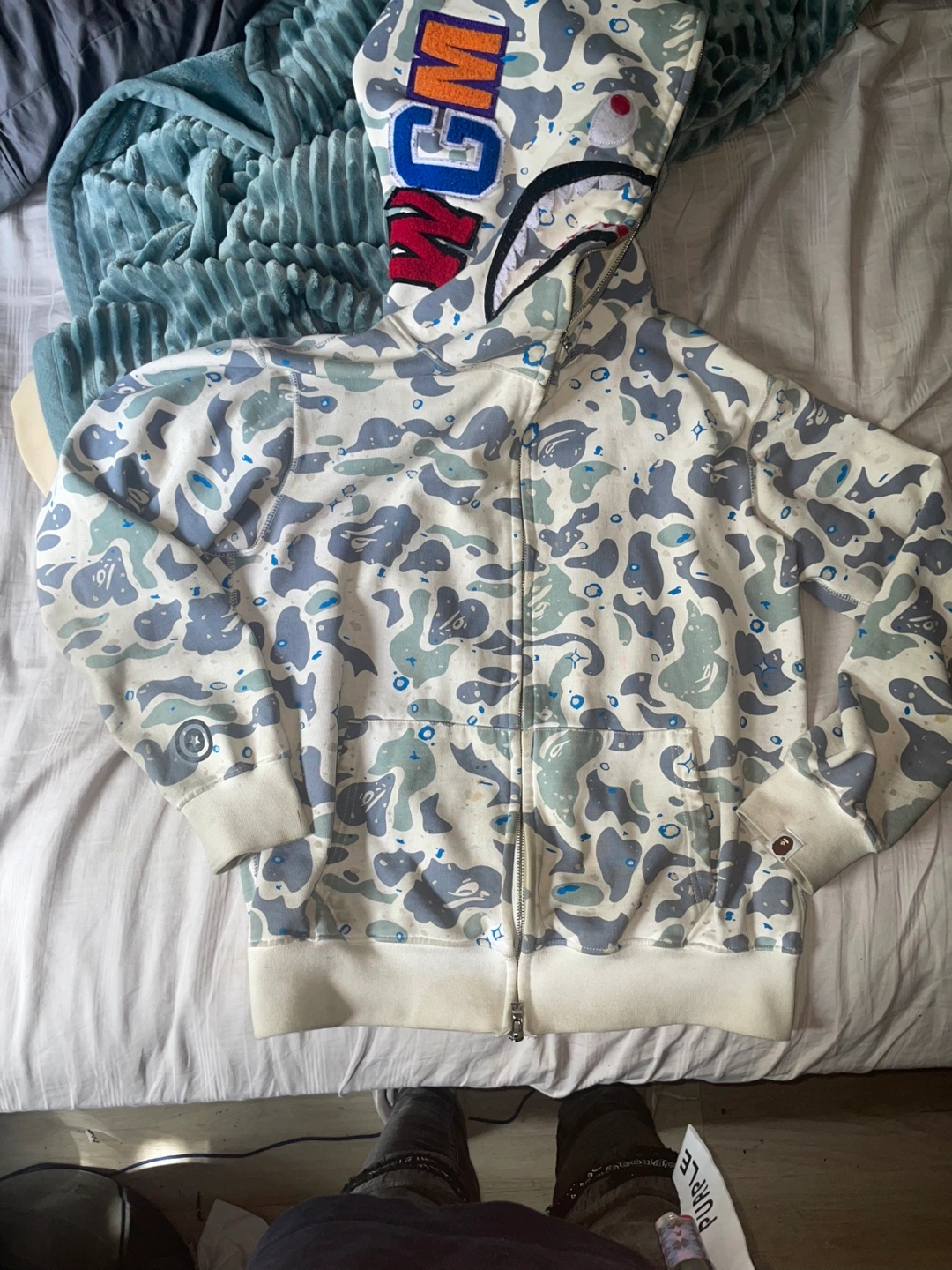 Men's size small Bape hoodie. Features a full zip closure, a large shark logo on the hood, and an all-over camouflage print that’s a grey and white color this is AUTHENTIC has all proper tags no bag or receipt will take trade offers price is slightly negotiable
