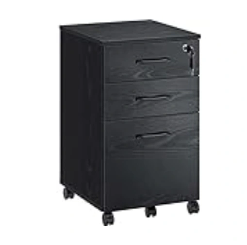 NEW AND UNOPENED BOX. Three-drawer mobile filing cabinet by Rolanstar. Features a black wood grain finish, black metal handles, and lockable top drawer. Includes four swivel casters for easy mobility. Perfect for office or home organization.