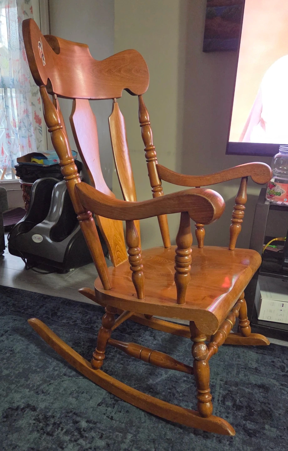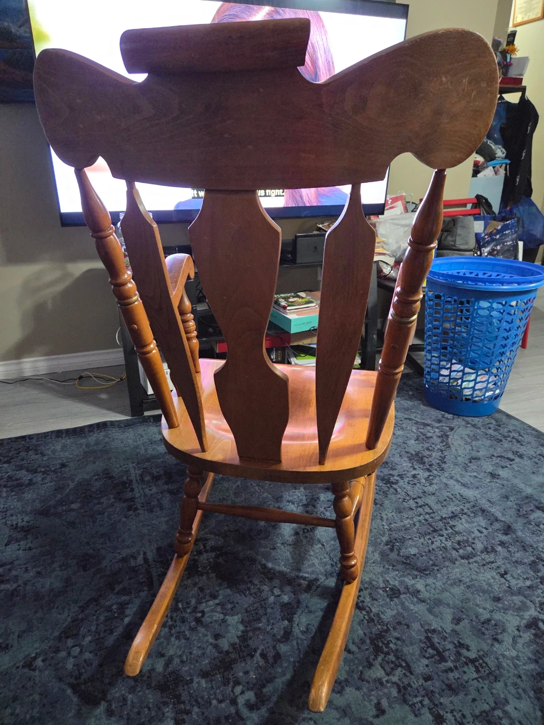 This is a classic oak wooden rocking chair with a natural wood finish. It features turned spindles and a contoured seat for comfort. The smooth rocking mechanism makes it great for relaxing. smoke free and pet free home