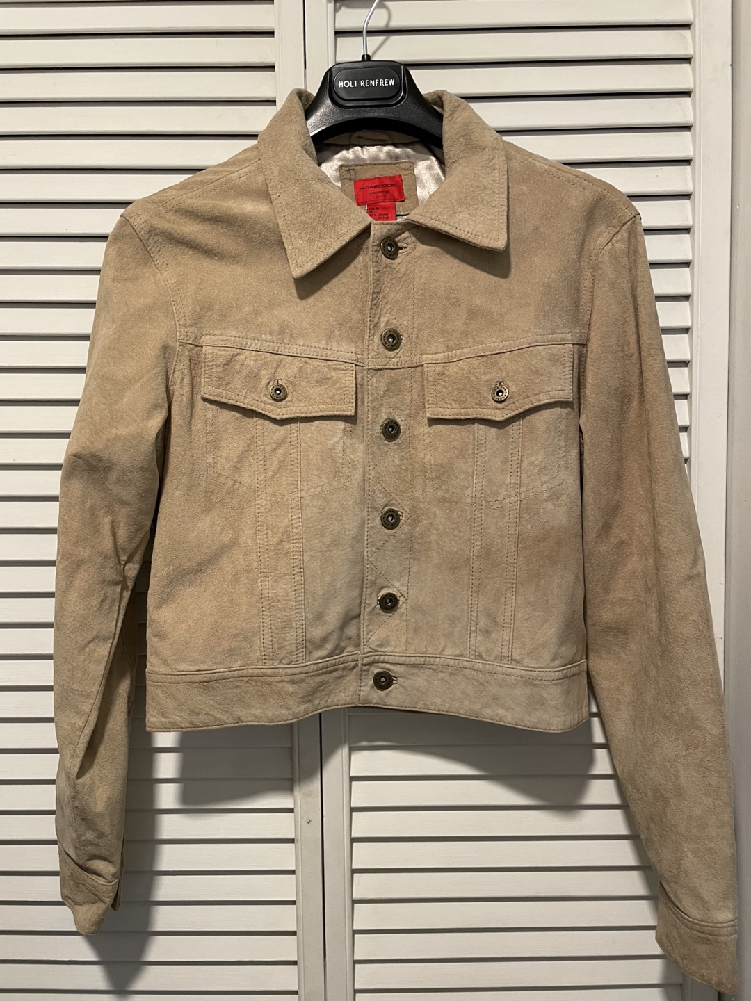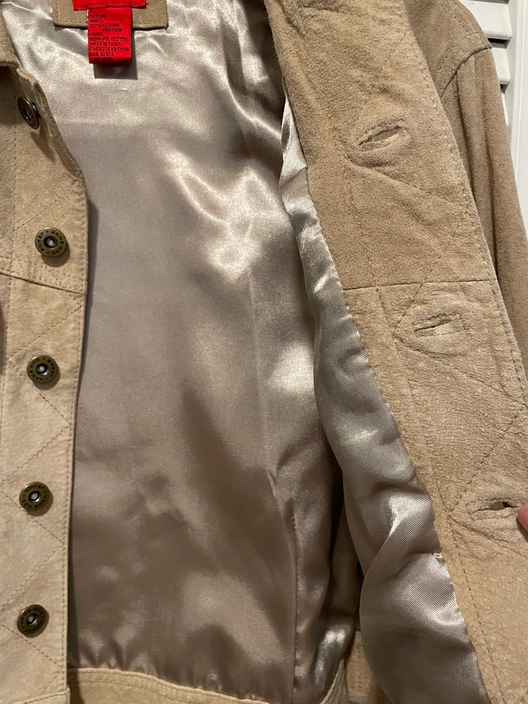 Women's soft suede jacket. Button closure. Two front pockets. Long sleeves. Light tan colour, lined.