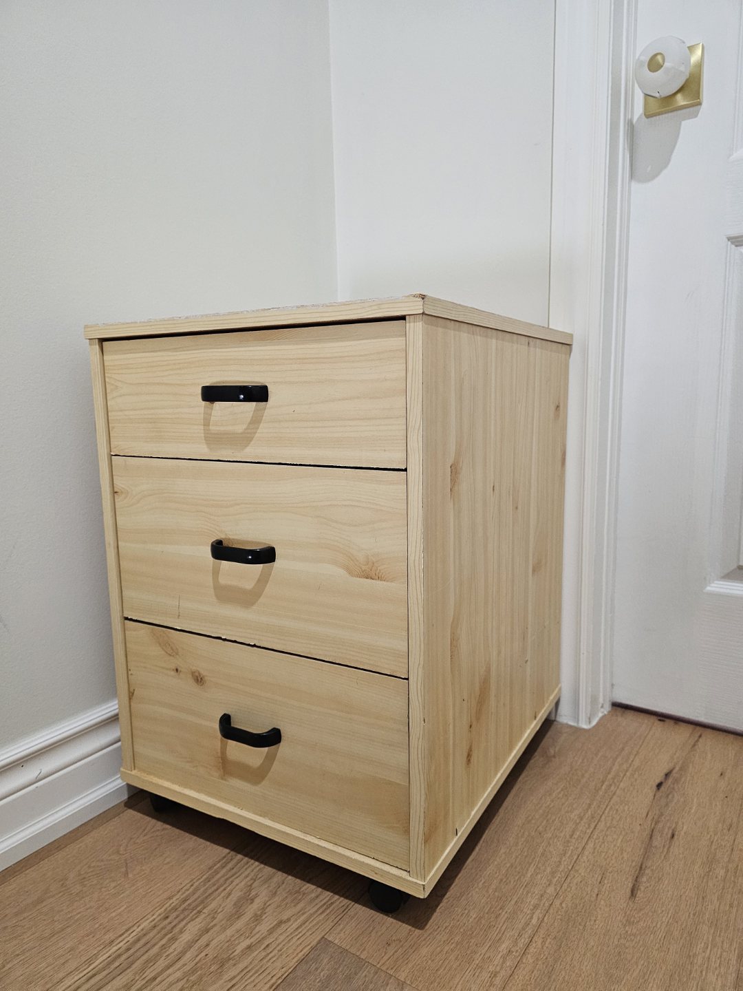 Small wooden chest of drawers. Three drawers, light wood finish. Black drawer pulls. Some minor wear. On wheels. Great for office as it slides under a desk, or in kids room.