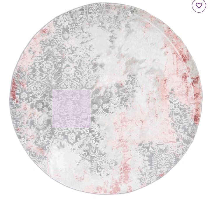 Beautiful round rug. Pink and grey colour scheme. Soft and comfortable. Machine washable. Perfect for living room or bedroom.
