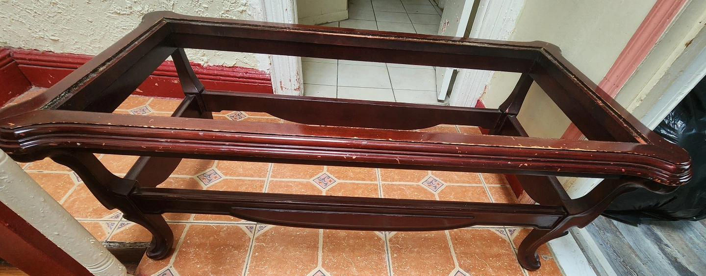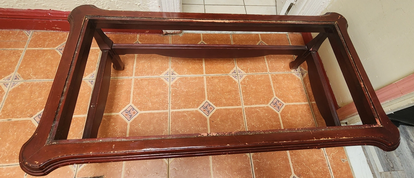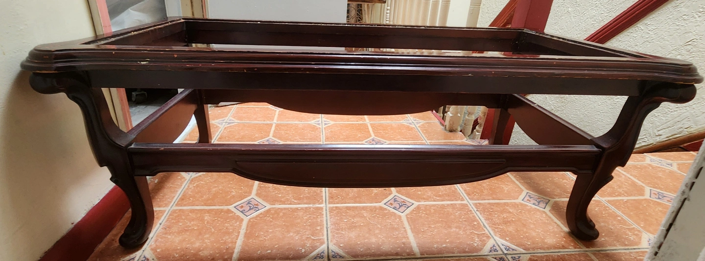 Antique-style coffee table frame. Dark Mahogany wood. Mirror top included. Scratches and wear are consistent with the age of the item. Ornate detailing. Perfect for restoration or an upcycling project.