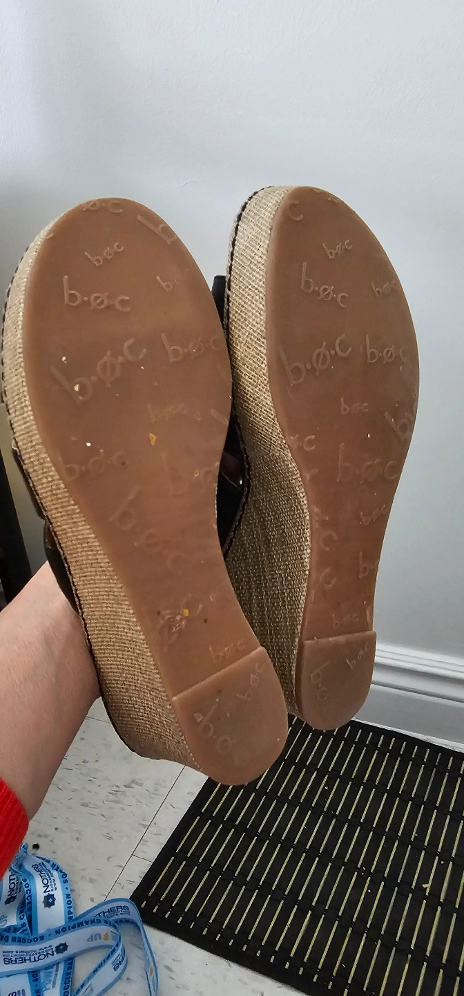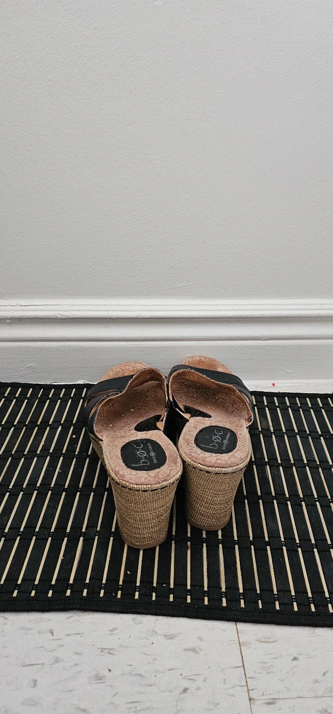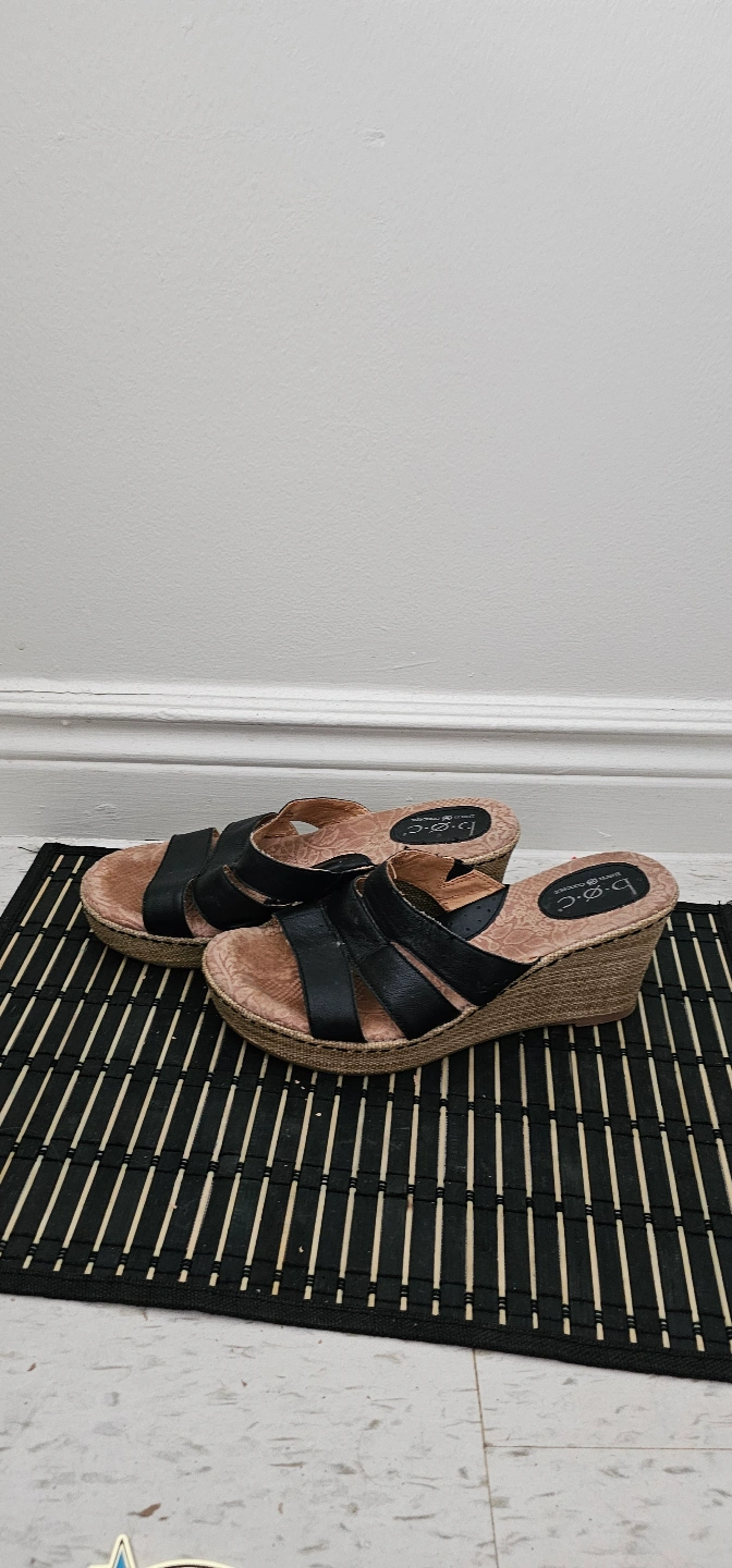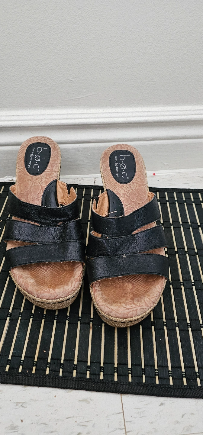 Pair of black leather b.o.c. wedge sandals. Features three straps across the foot. Wedge sole is made of woven material. Size not specified.