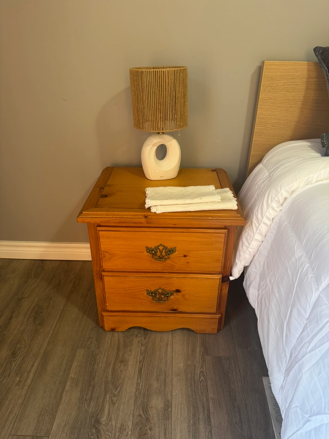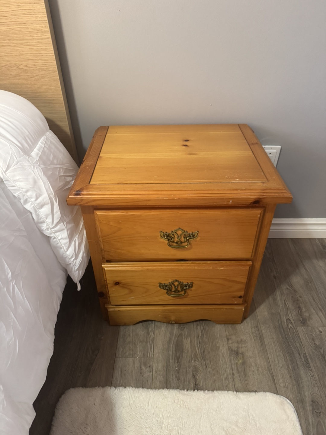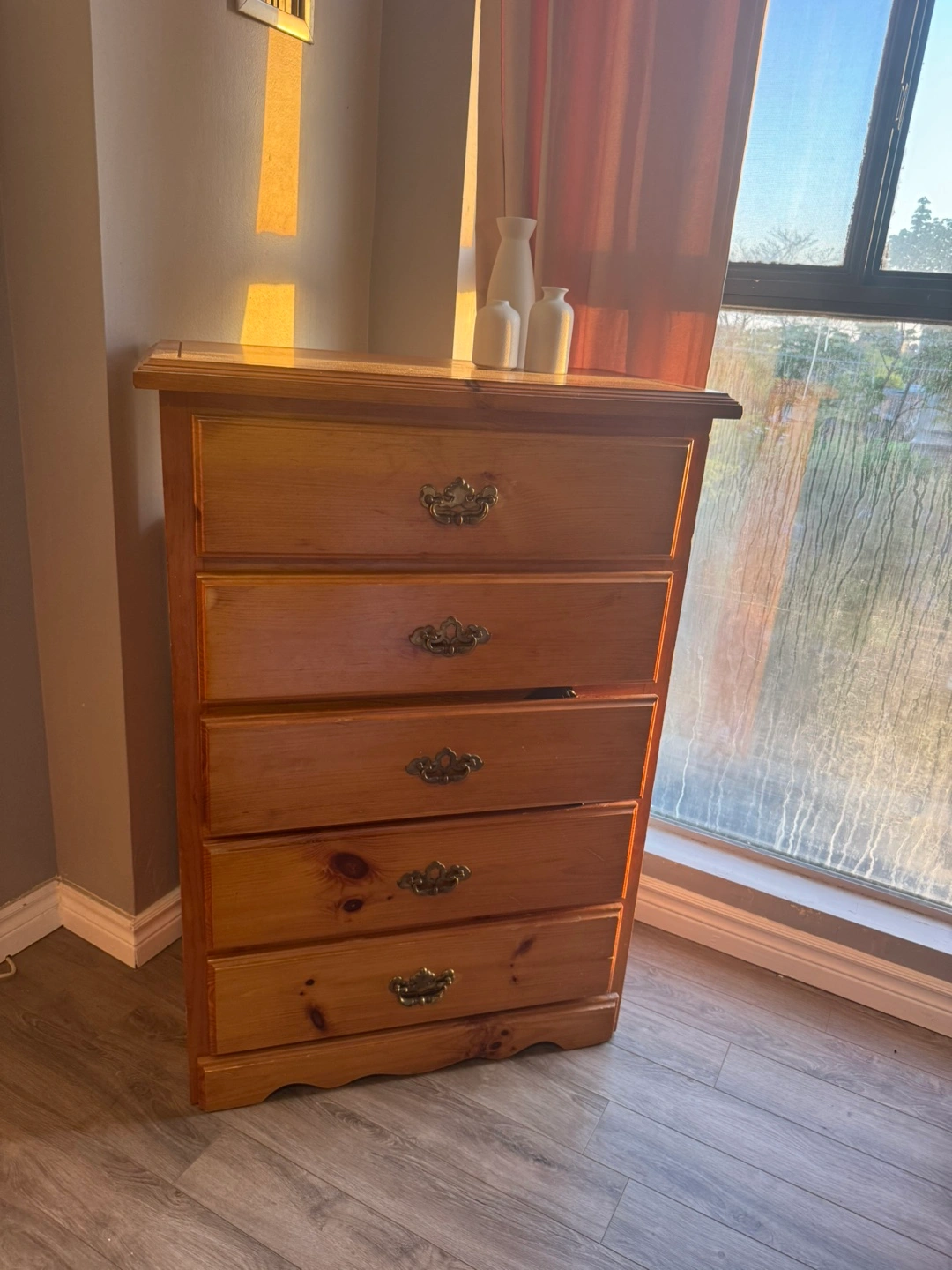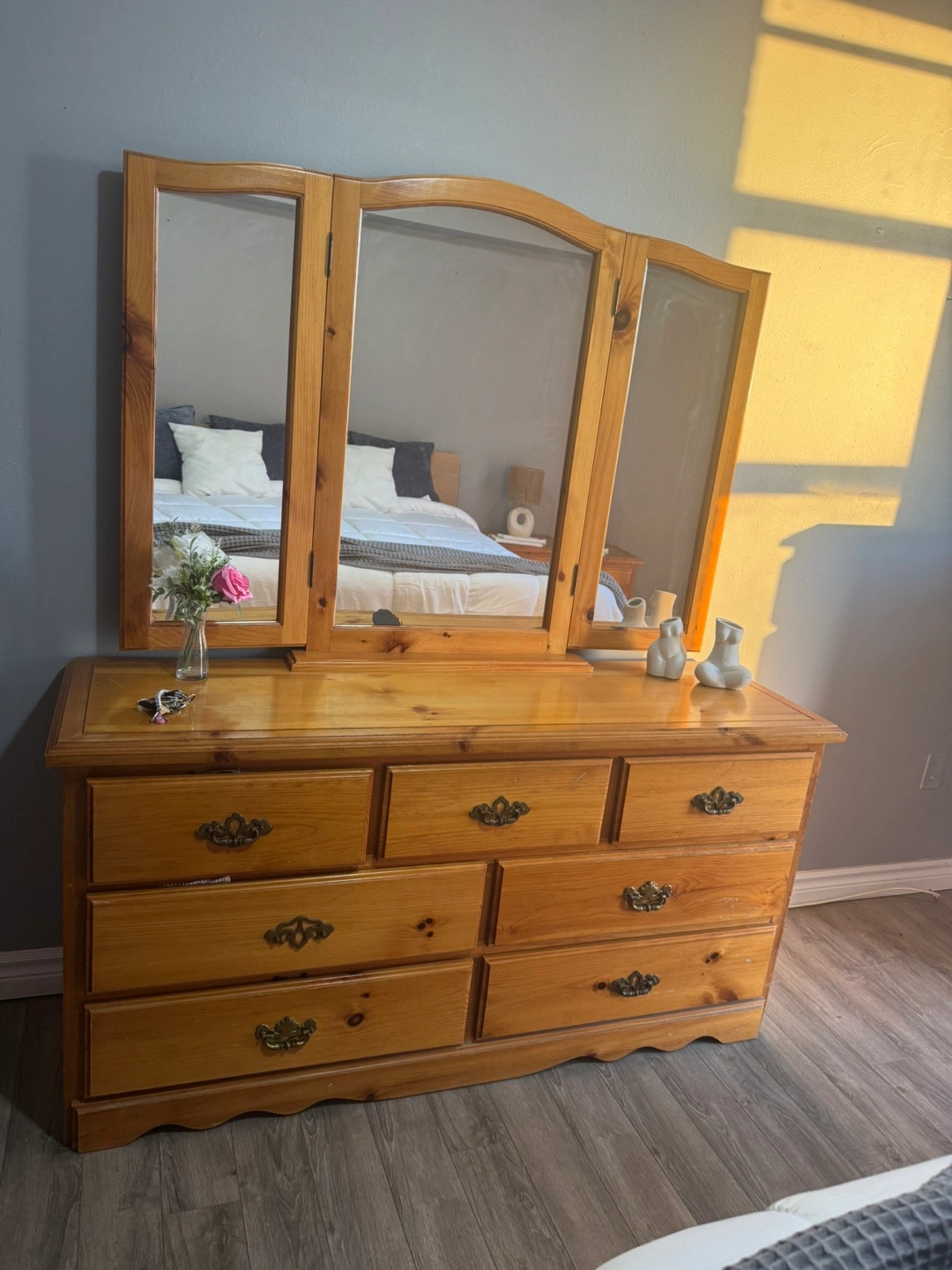 Solid pine bedroom furniture set. Includes a five-drawer dresser, two two-drawer nightstands, and a tri-fold mirror. Features brass-toned hardware. Used, but in good condition. Perfect for a rustic or cottage-style bedroom.
