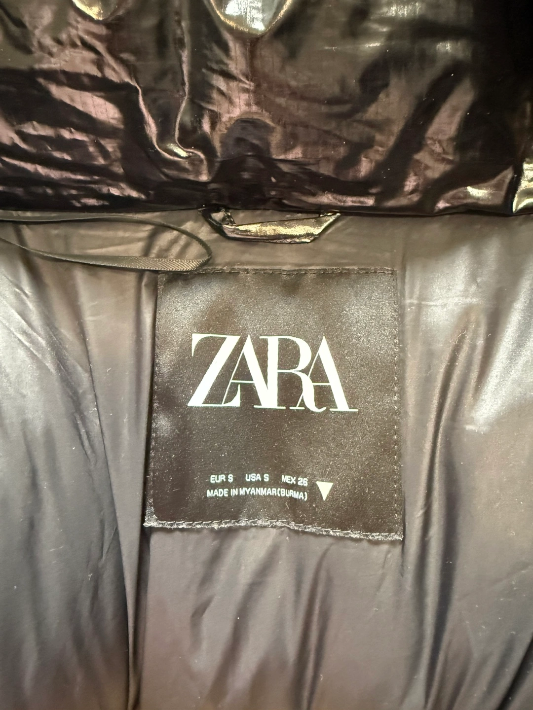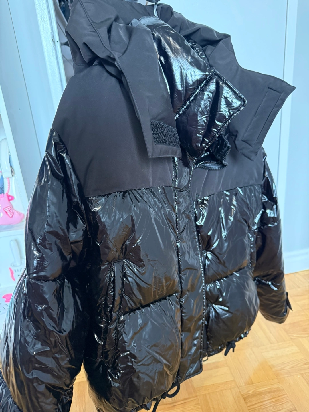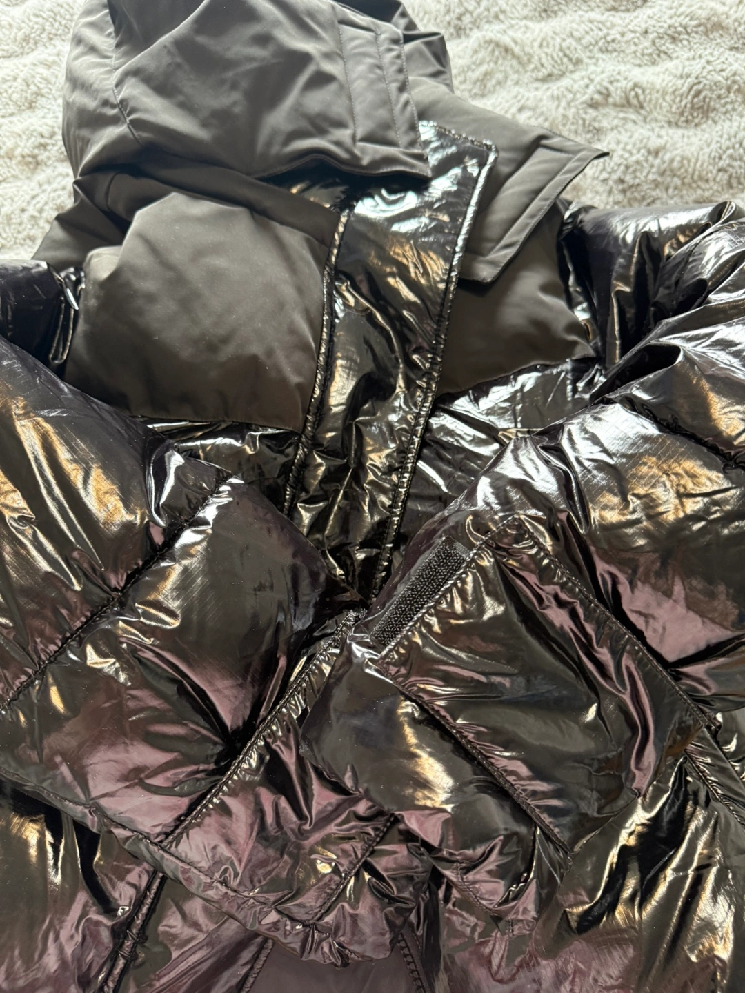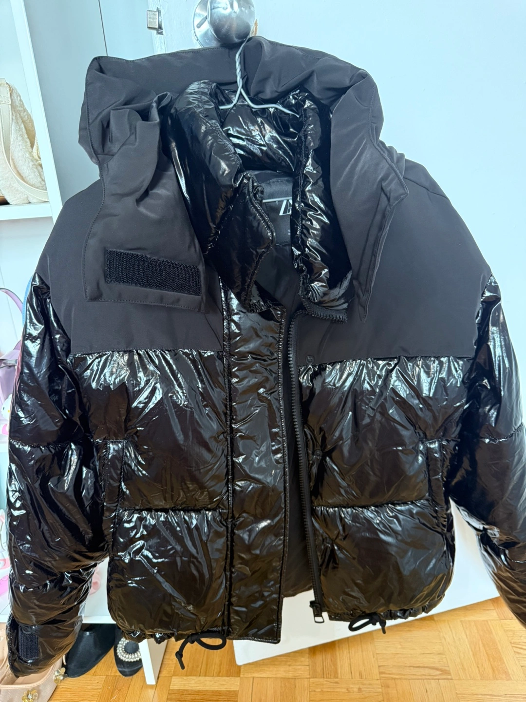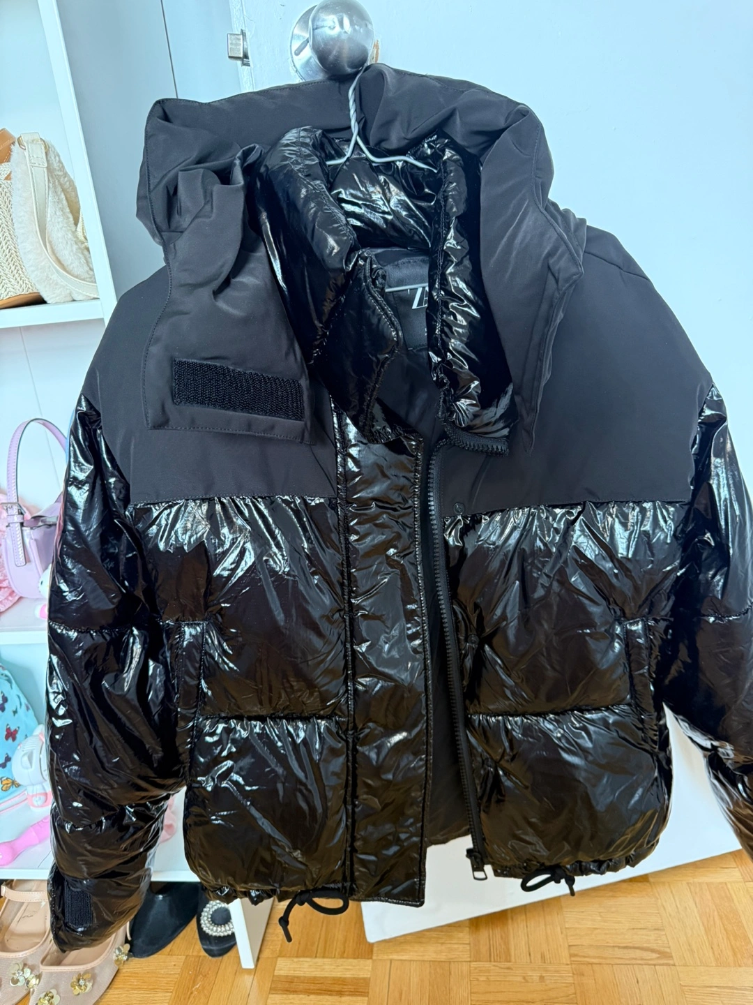 157Black shiny puffer jacket. Size small. Features a hood and zipper closure. Excellent condition.