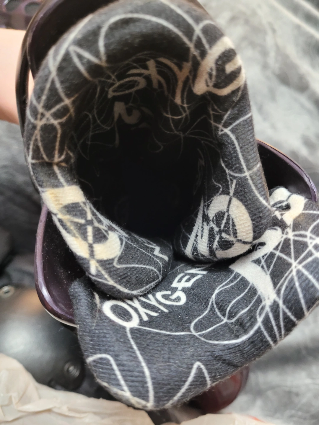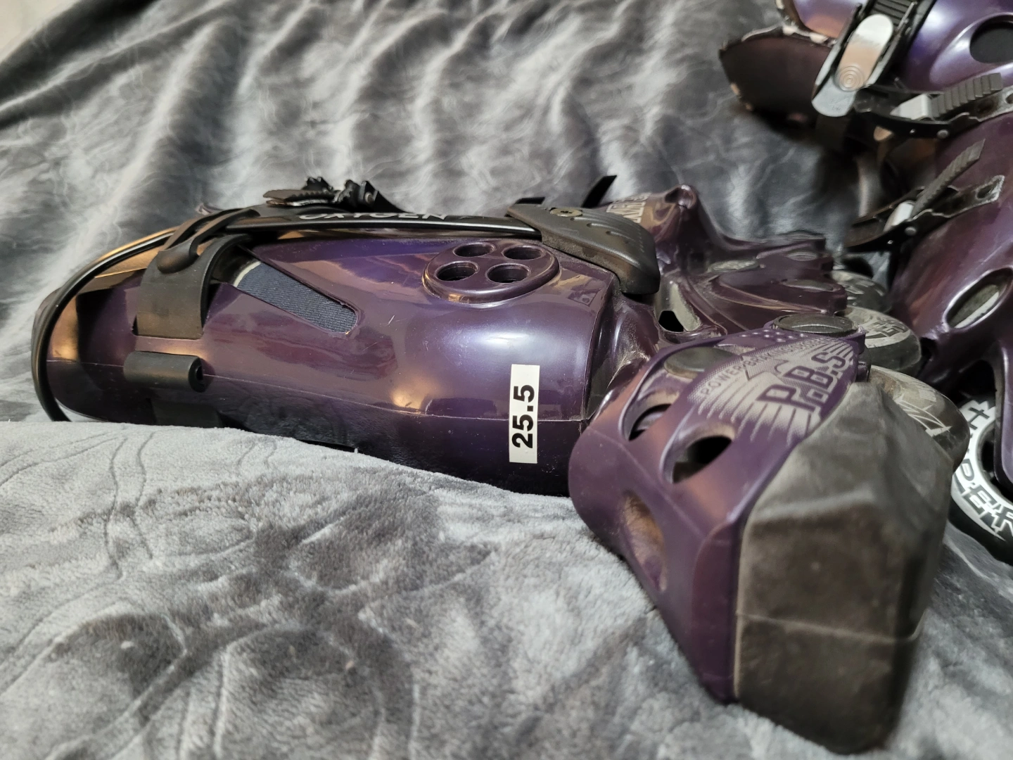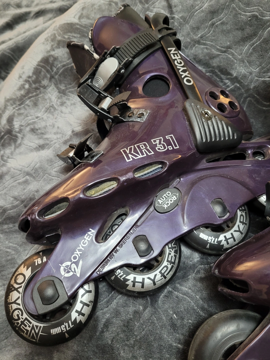 Pair of Vintage 1990's purple Oxygen KR 3.1 inline skates, barely used, like new condition. Bundle includes Bauer knee and elbow pads, and Rollerblade wrist guards, all in good condition. Size 8.5 women's (7.5 men's)