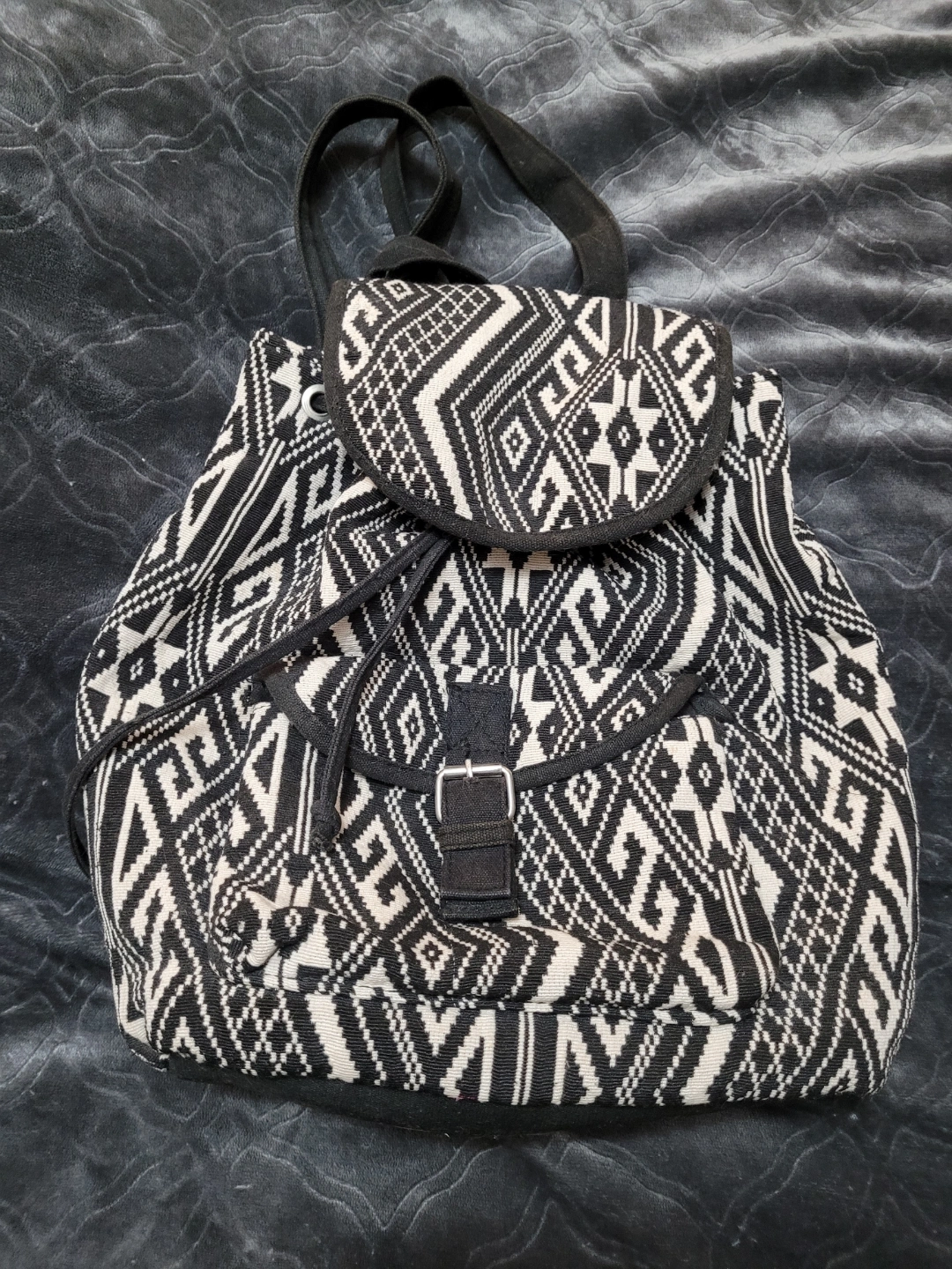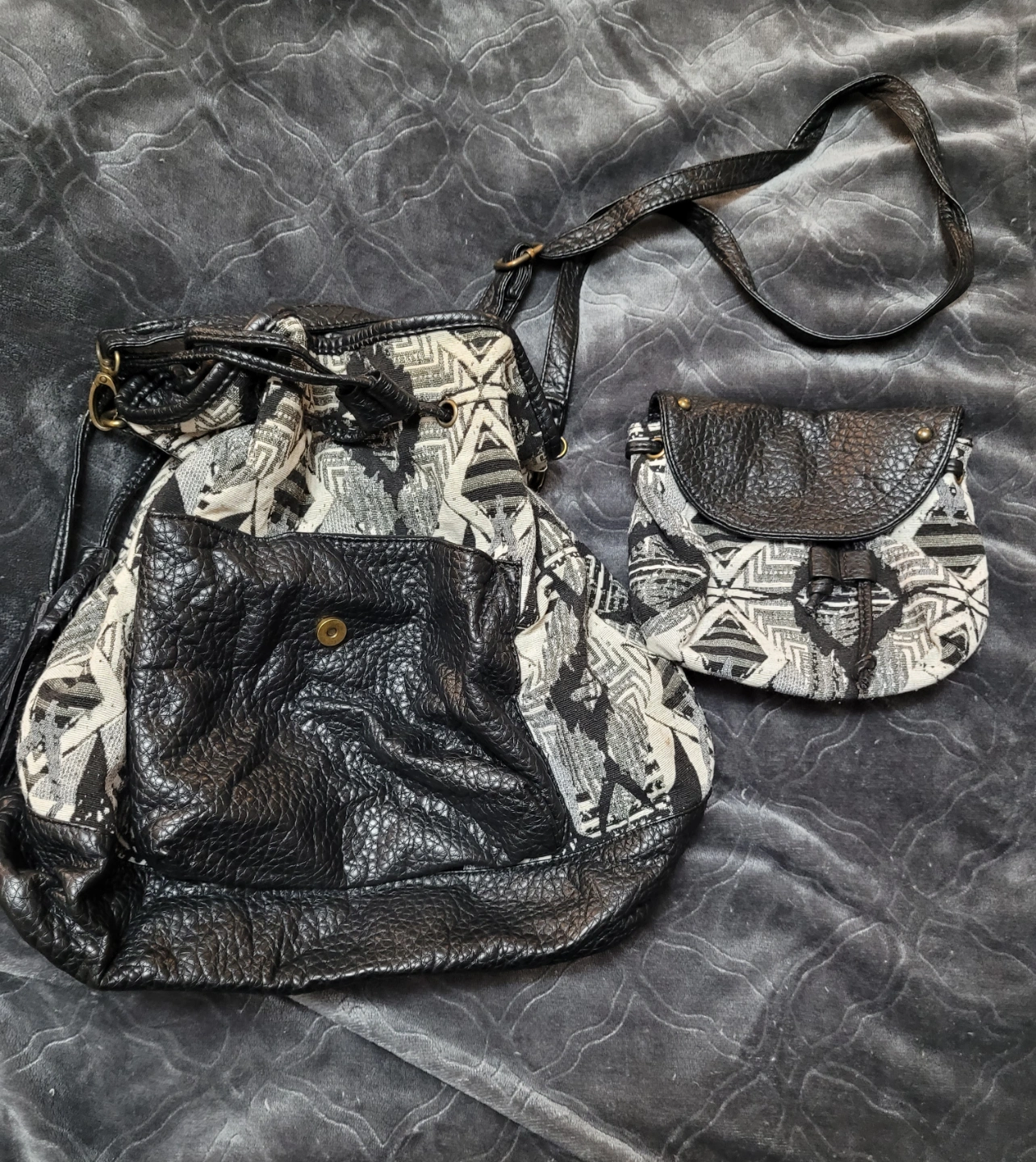 Set of two bags. One black faux leather drawstring cross body purse, that has a smaller detachable purse in the front pocket that the straps can attach to , so either purse can be used. And one black and white patterned backpack, quite roomy. Both have adjustable straps. Great for everyday use or travel.