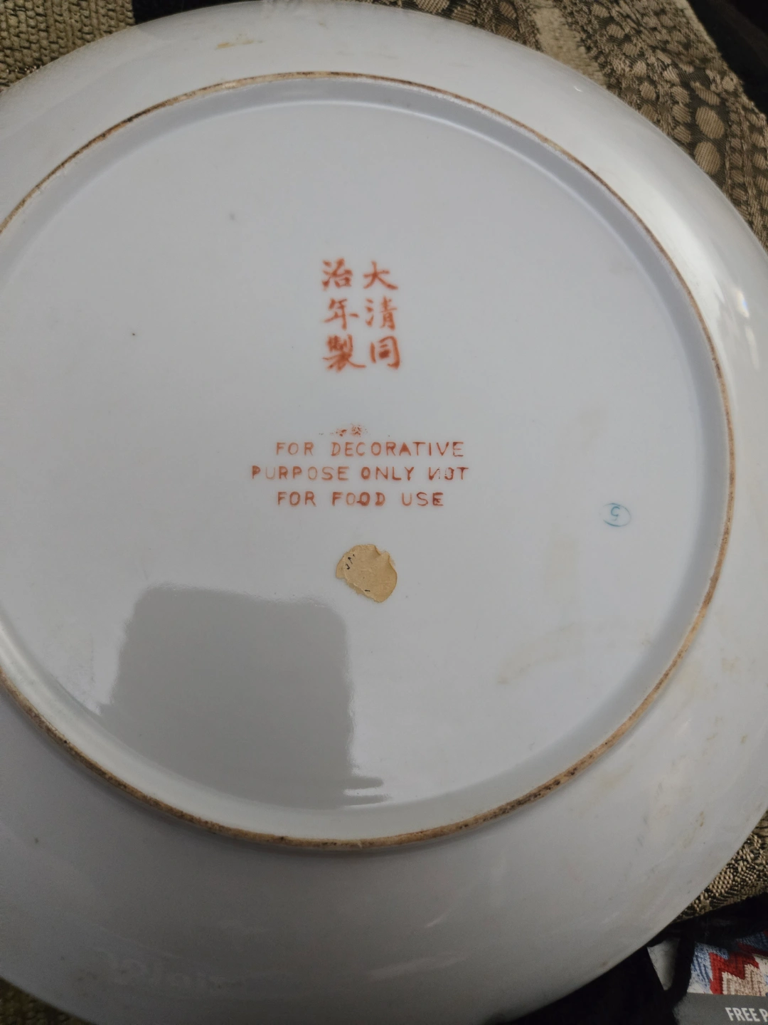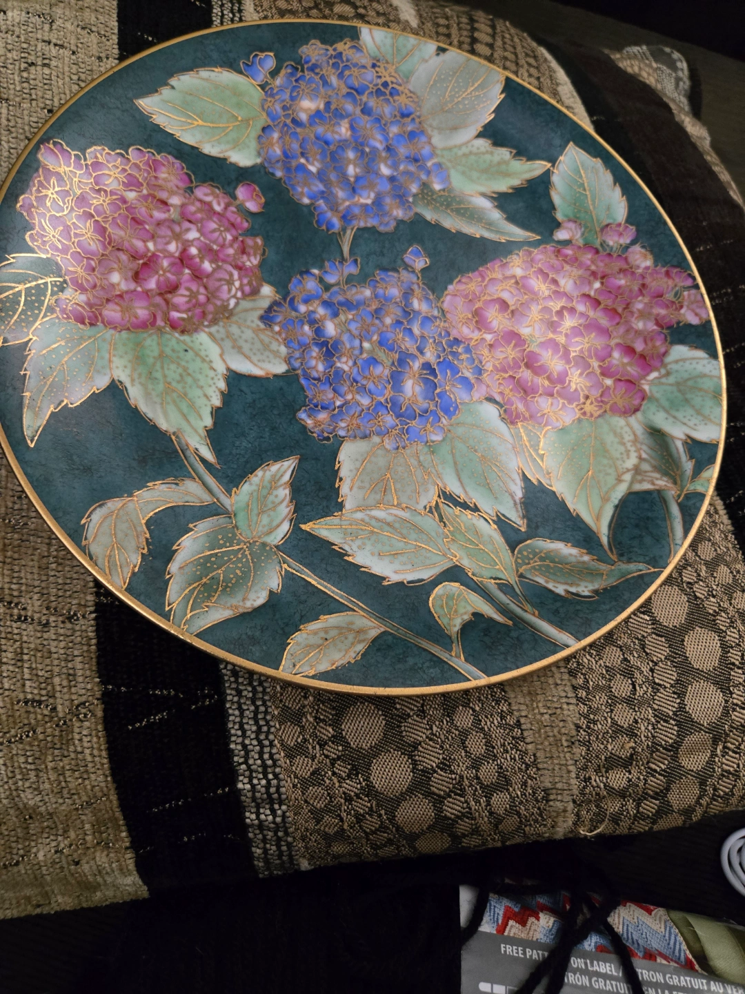 94Beautiful decorative plate. Features a lovely hydrangea floral design. Gold accents. For decorative purposes only, not for food use. Excellent condition. comes with stand