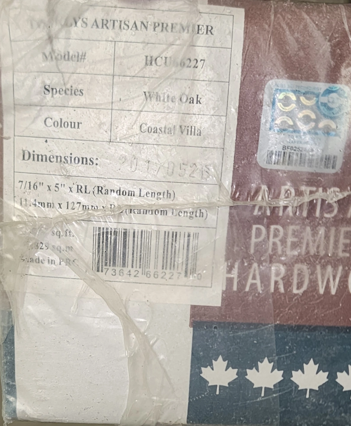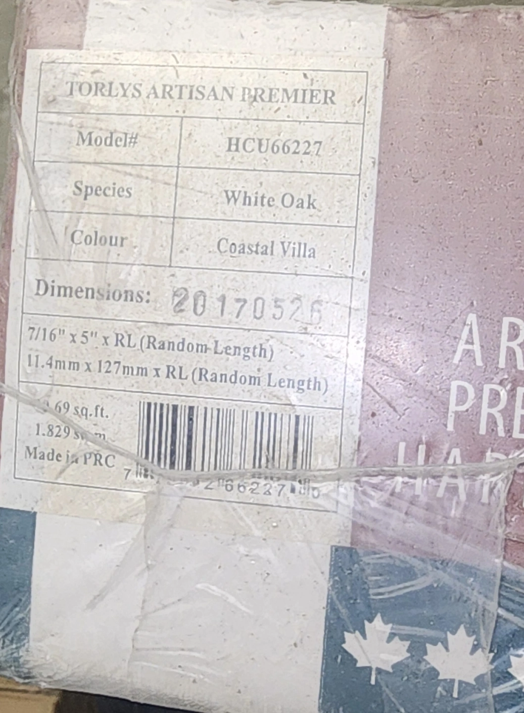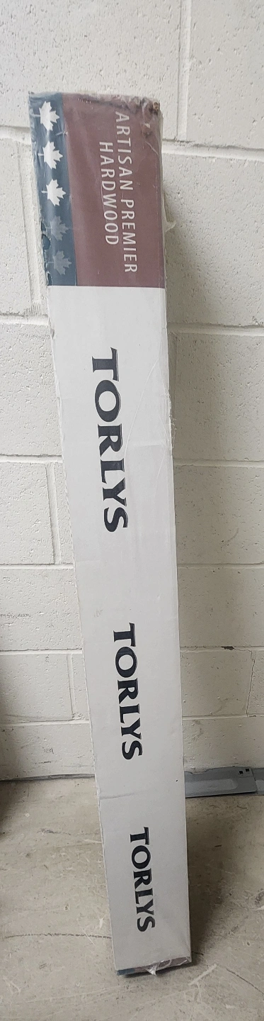 New box of Torlys Artisan Premier hardwood flooring. White Oak in Coastal Villa colour. Model# HCU66227. Random length planks. Approximately 69 sq ft.