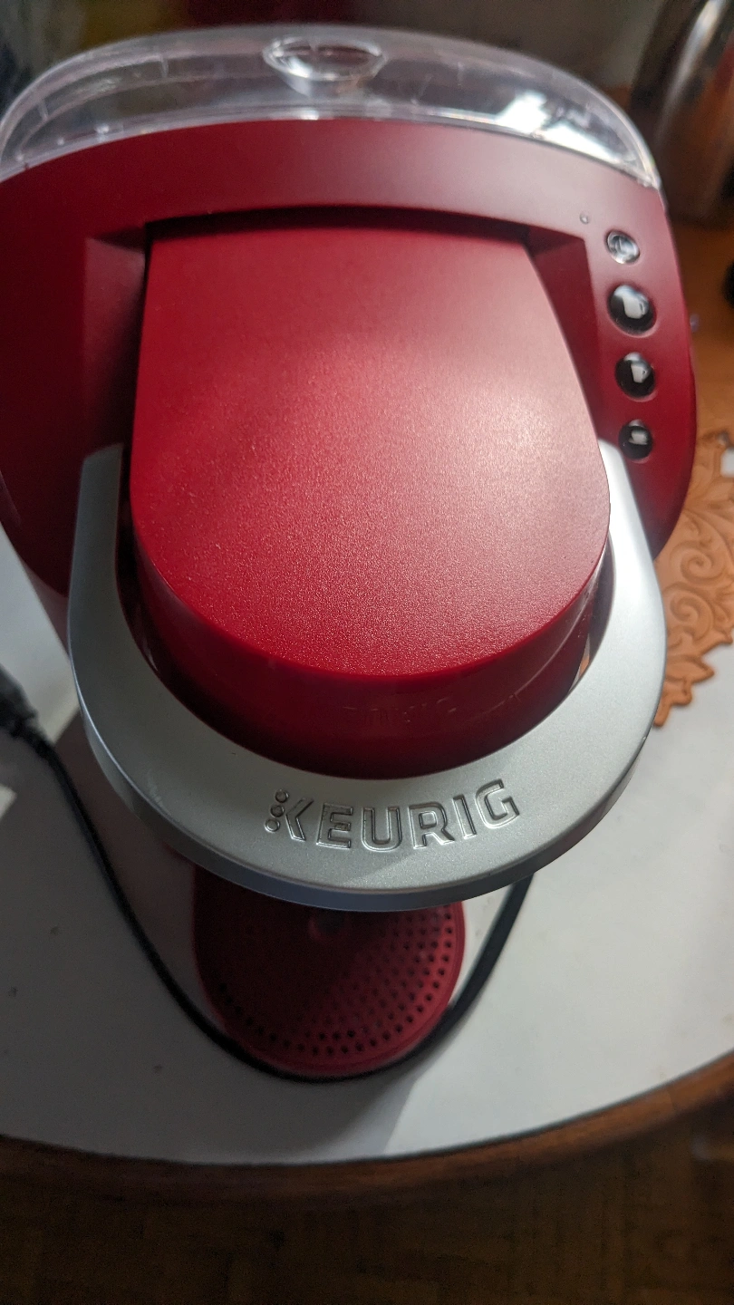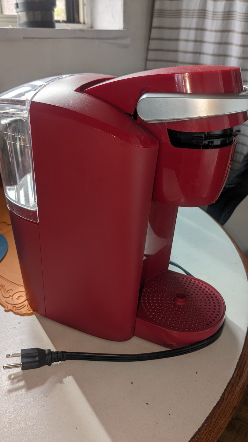 Red Keurig K-Select coffee maker. Single serve. Makes one cup at a time. Compact design. Easy to use.