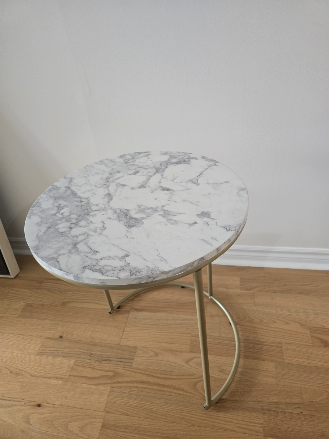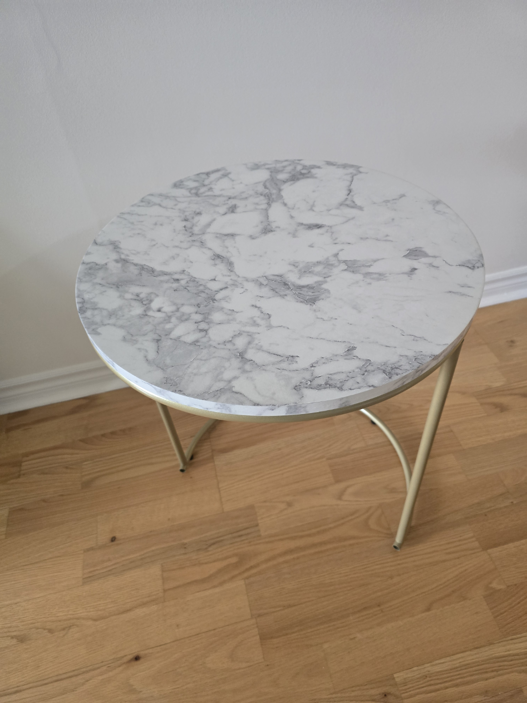 Small round side table. Marble-look (wooden) top. Gold-coloured metal legs. Perfect for a small space. Minimalist design. 1 piece