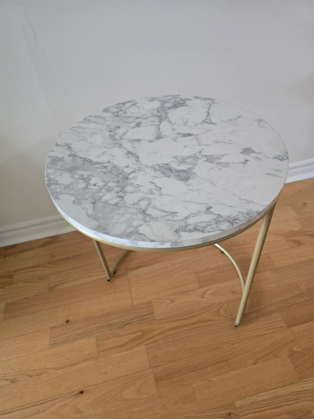 Small round side table. Marble-look (wooden) top. Gold-coloured metal legs. Perfect for a small space. Minimalist design. 1 piece
