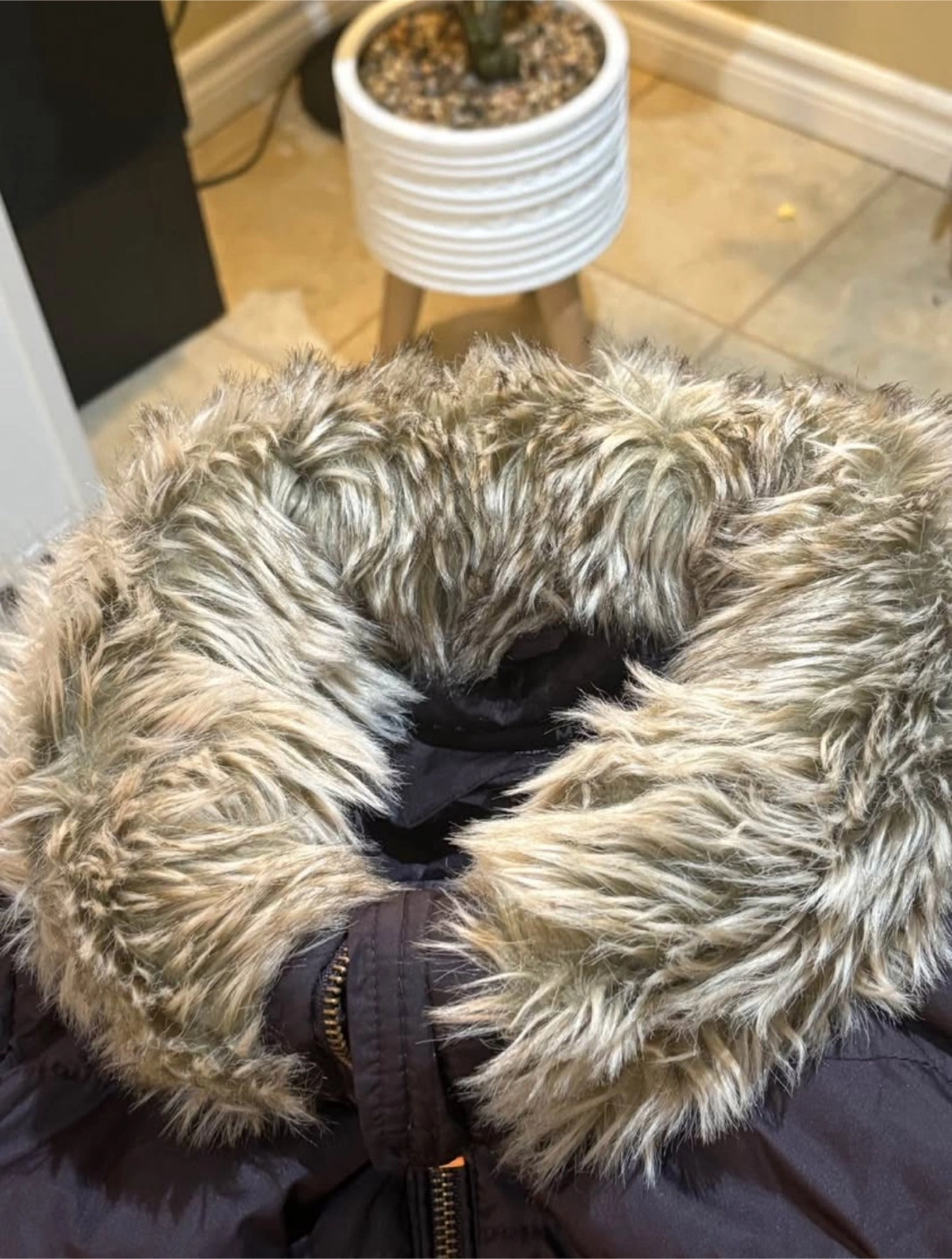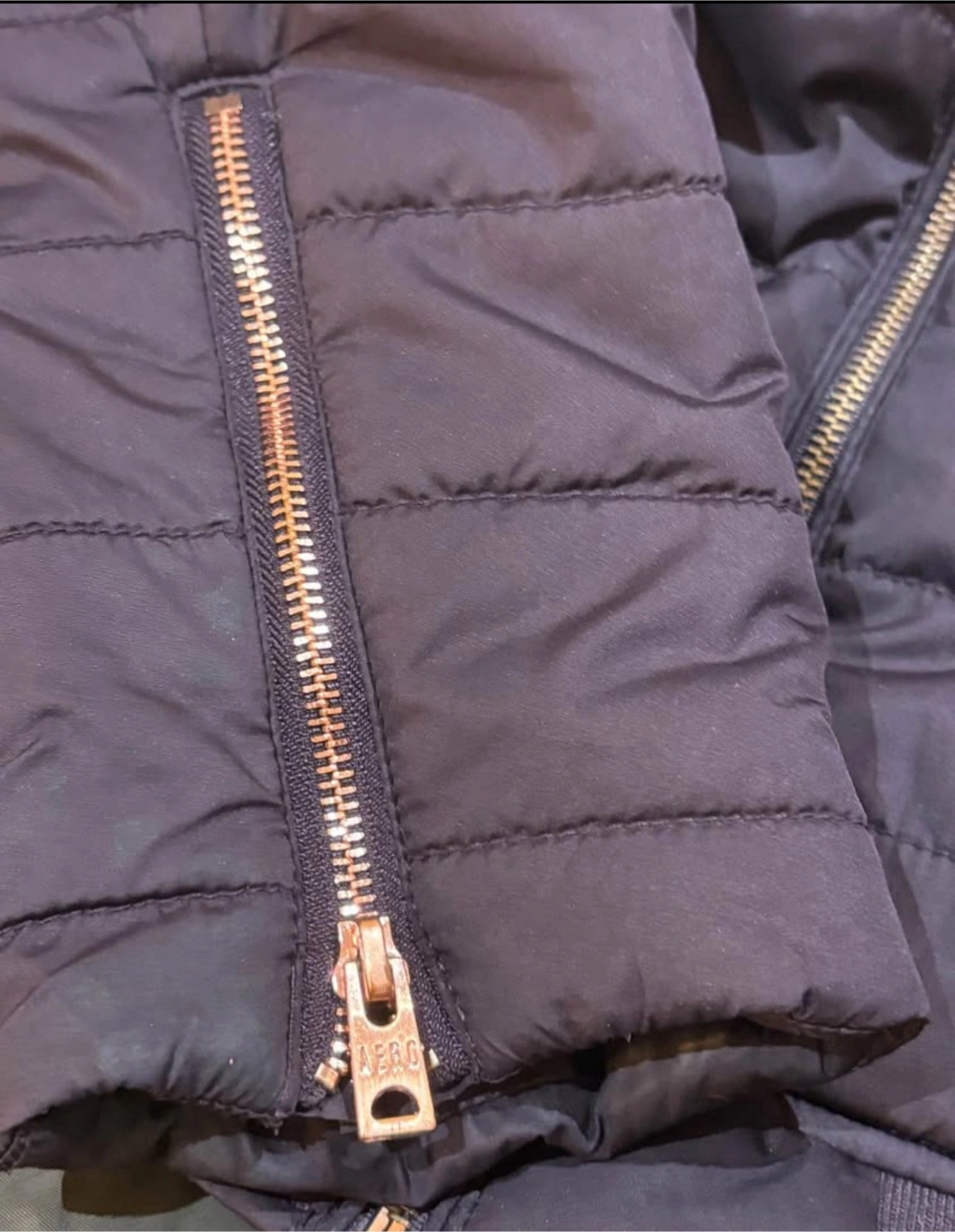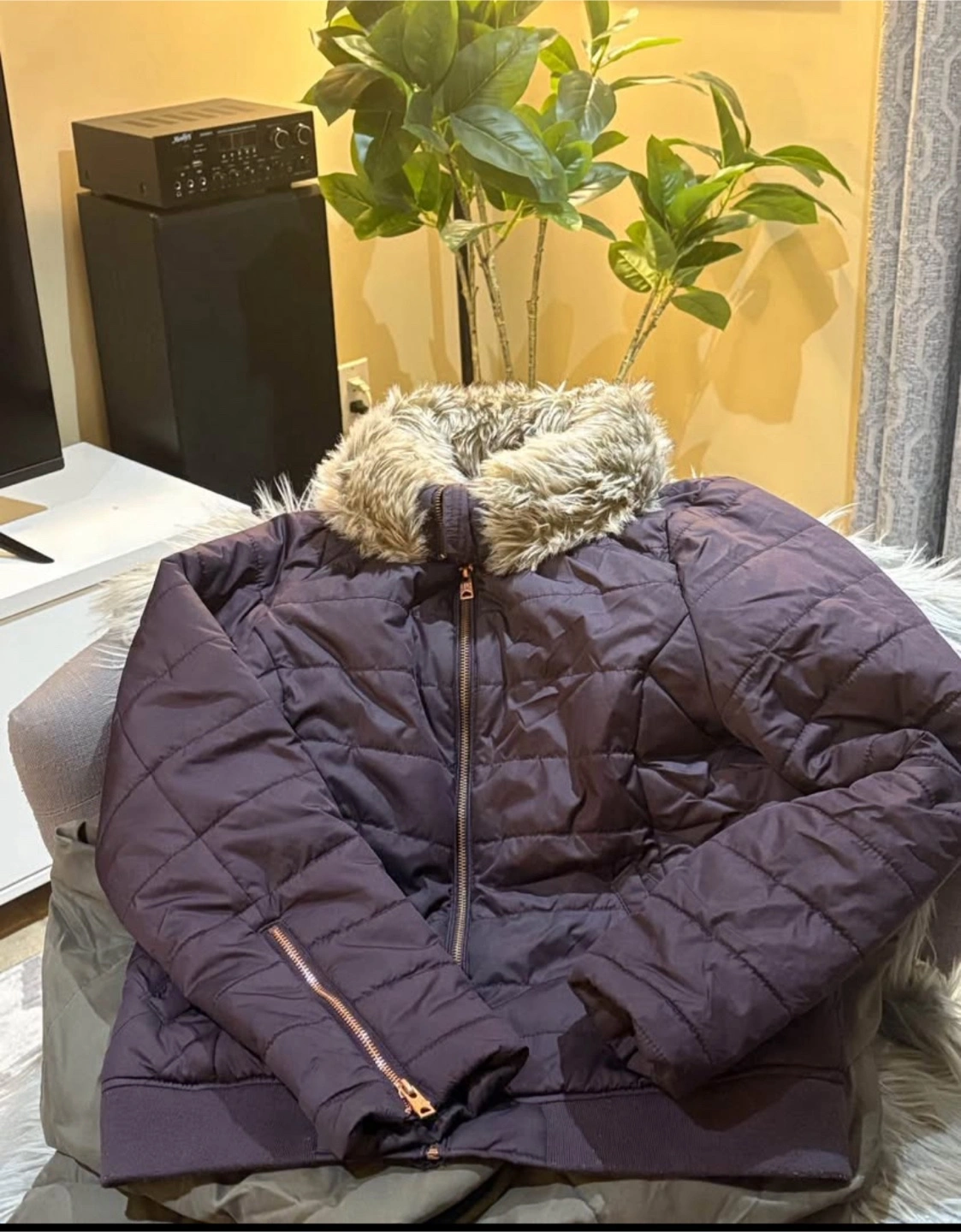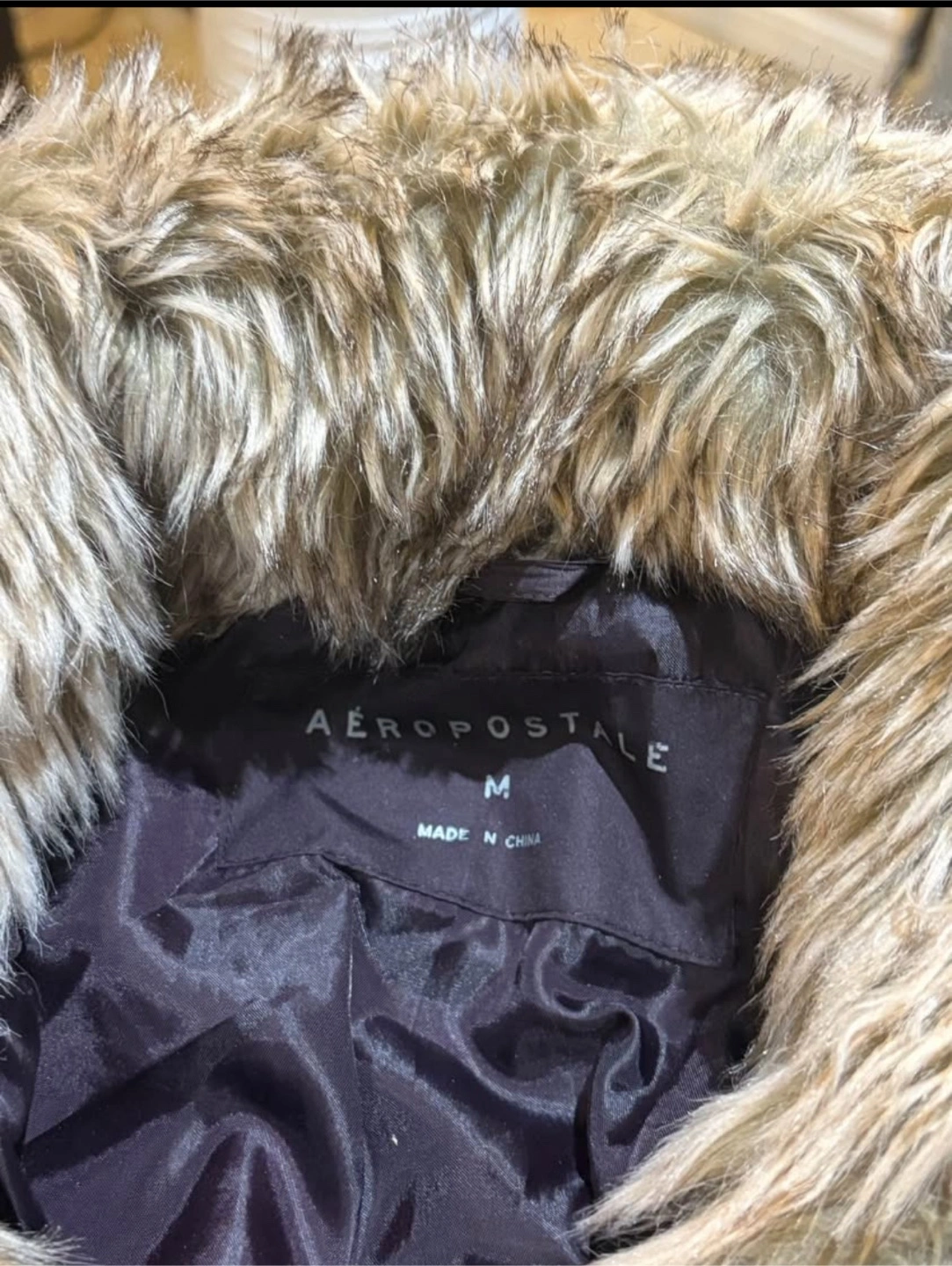 Women's Aéropostale puffer jacket. Size medium. Features a faux fur collar and rose gold zippers. Quilted design. Warm and stylish.