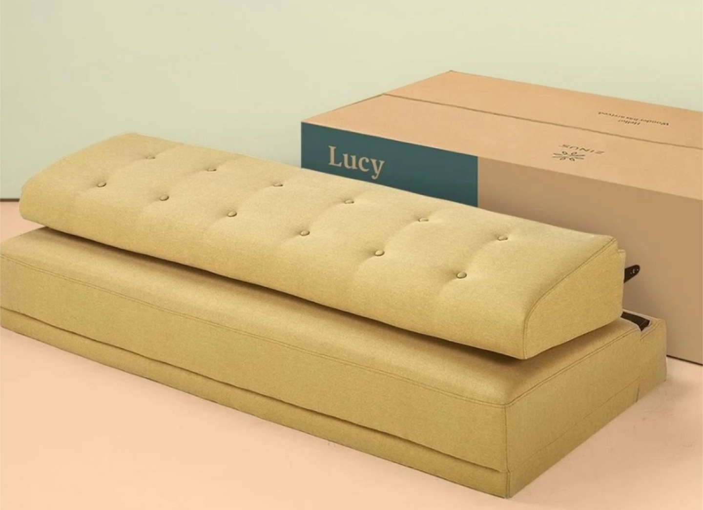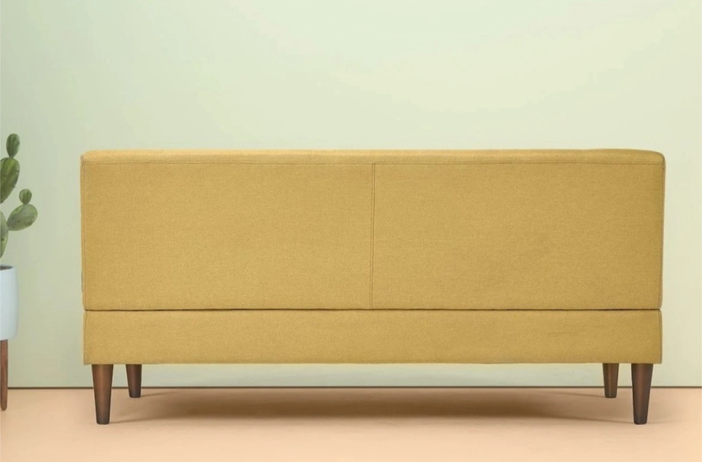 Mustard yellow fabric armless sofa. Mid-century modern style. Button tufted. Wooden legs. Compact size. Perfect for small spaces.
