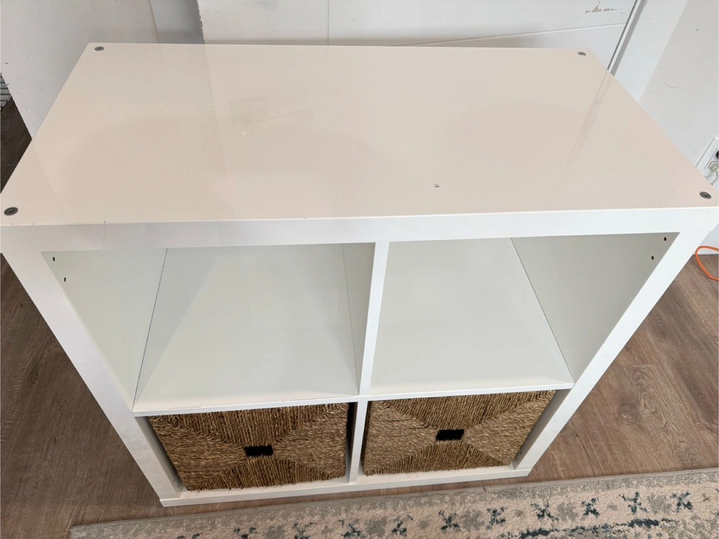 White shelving unit, four cubes. Woven storage baskets. They are sold seperately. Minor cosmetic imperfections.