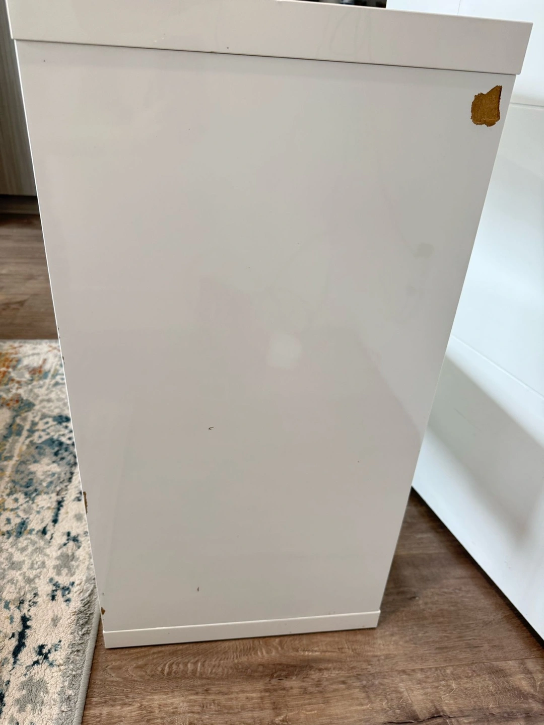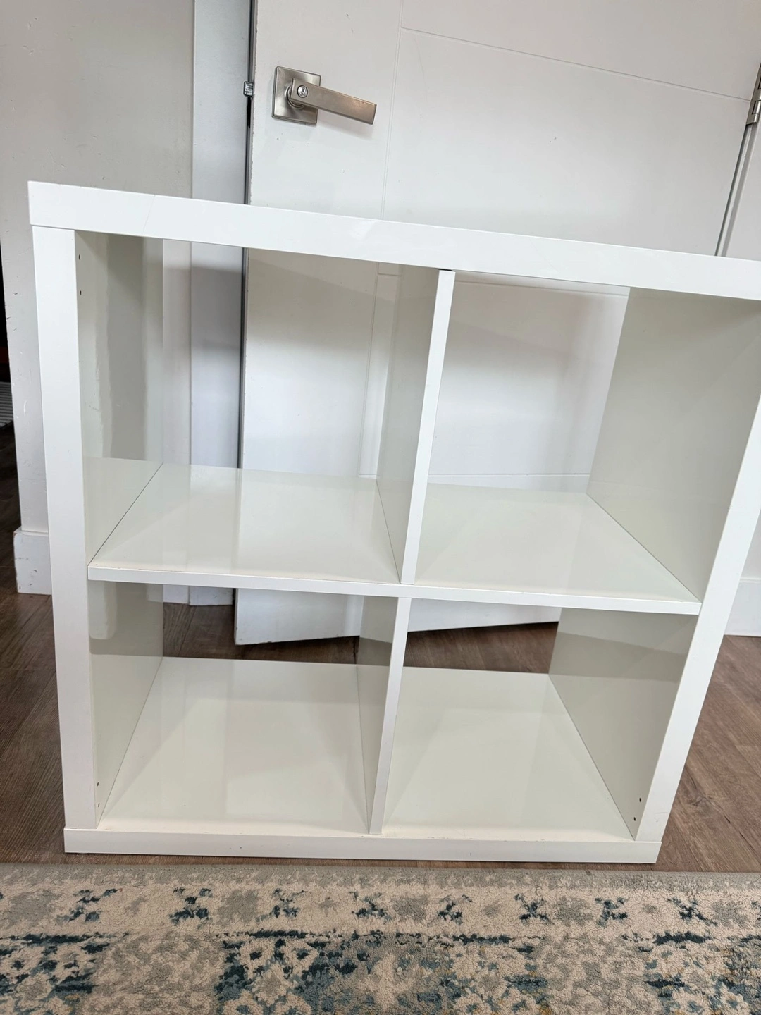 White shelving unit, four cubes. Woven storage baskets. They are sold seperately. Minor cosmetic imperfections.