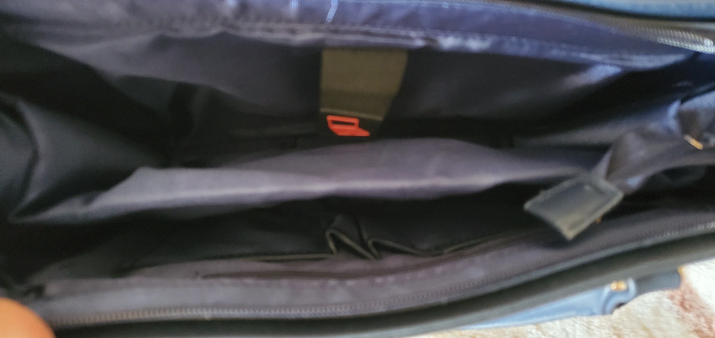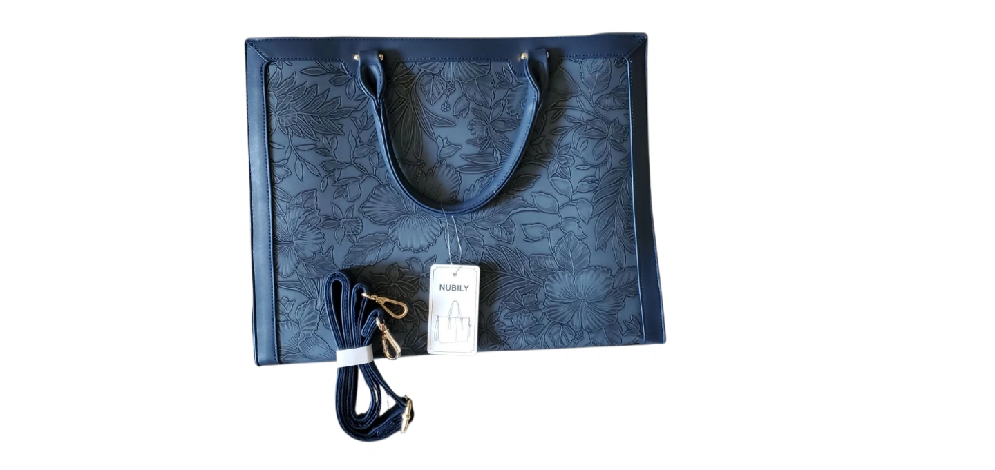 Dark blue laptop or tote bag. Embossed floral pattern. Top handles and a detachable shoulder strap. Interior pockets. Zipper closure.