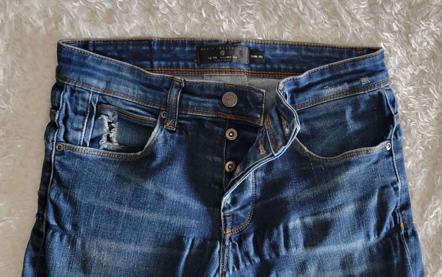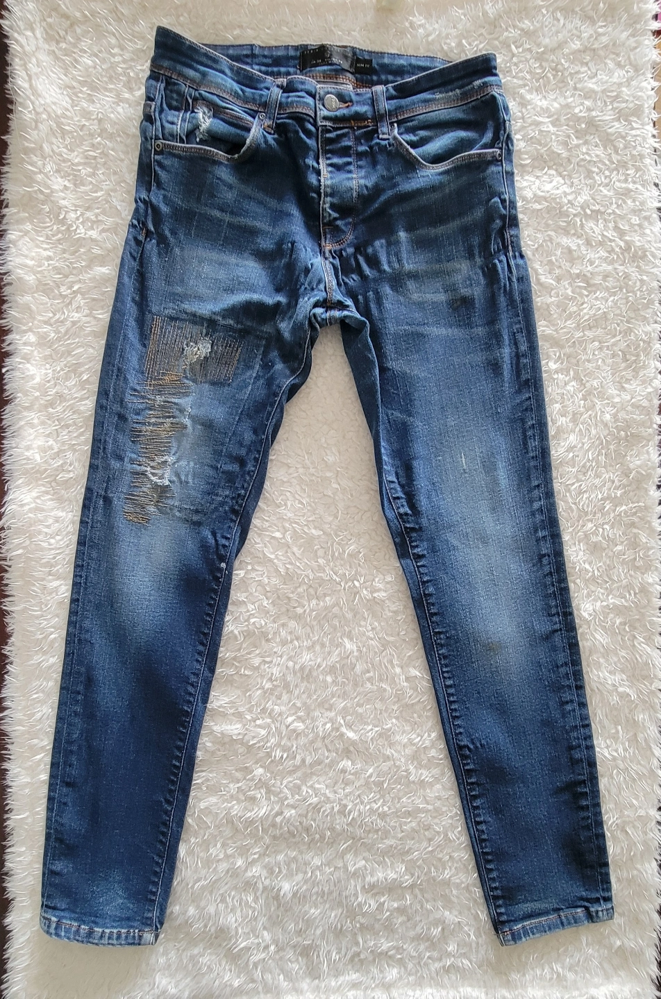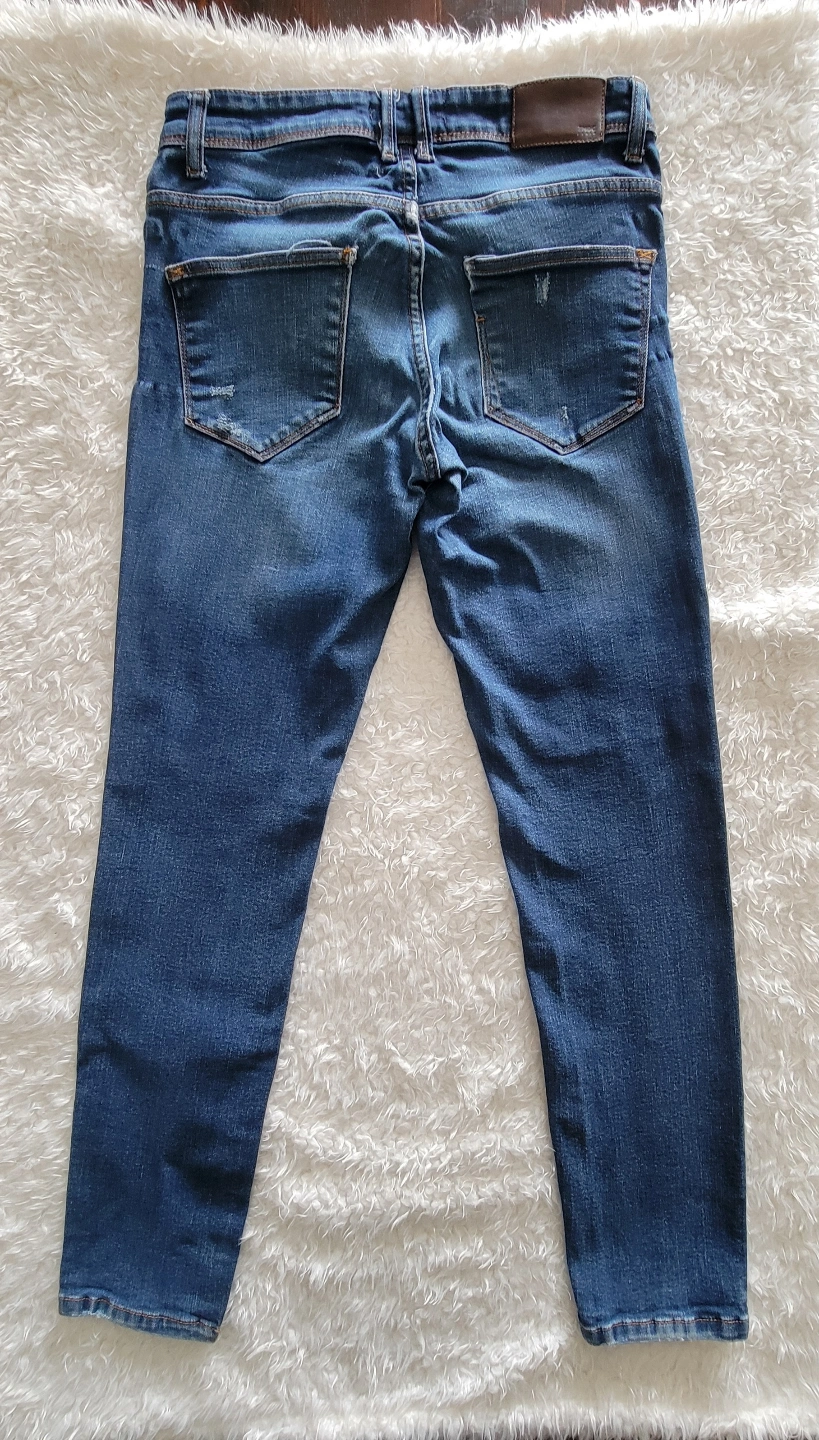 Men's Zara Man denim jeans. Slim fit. Size 32. Features distressed detailing. Button fly. Pre-owned.