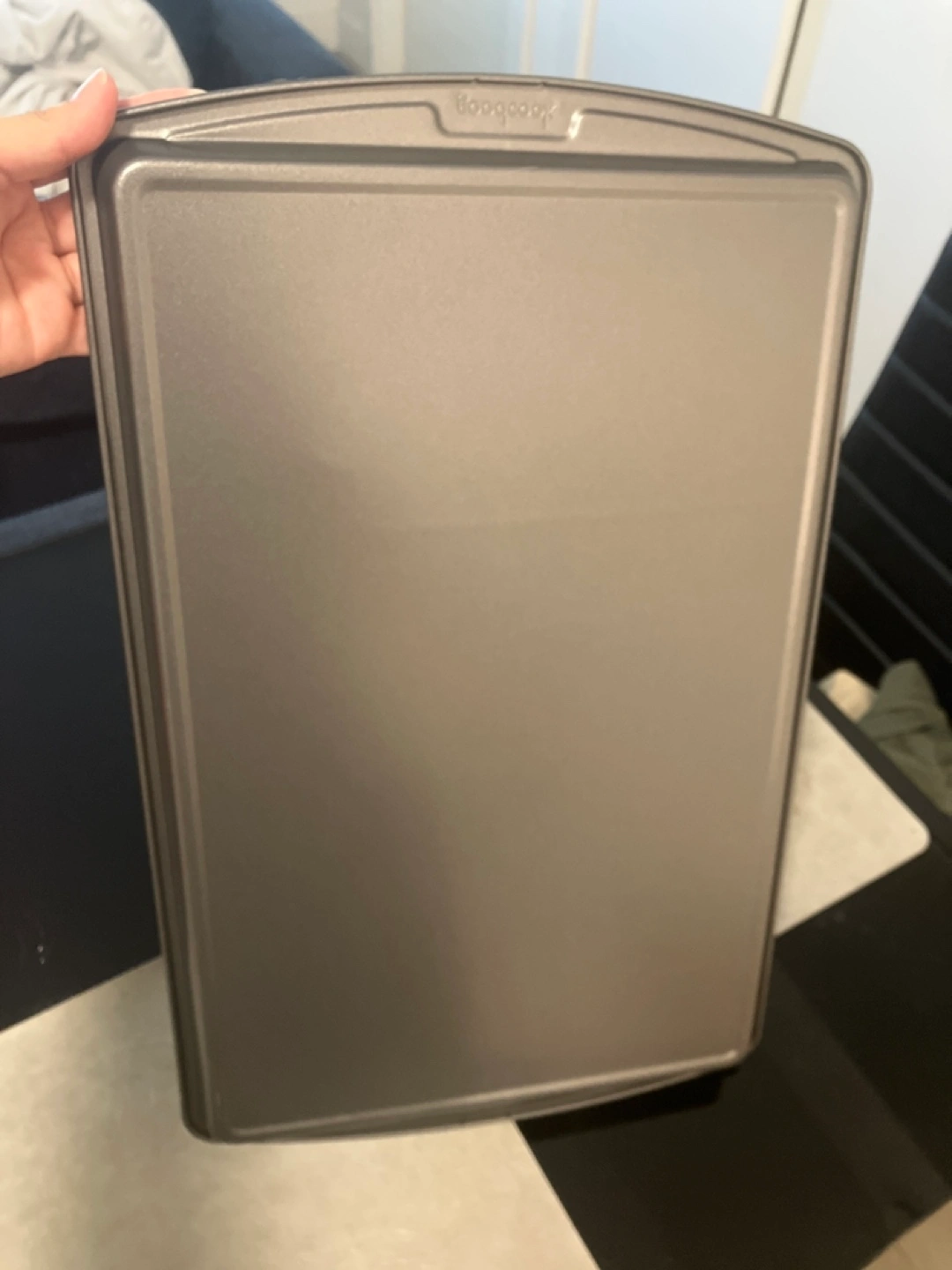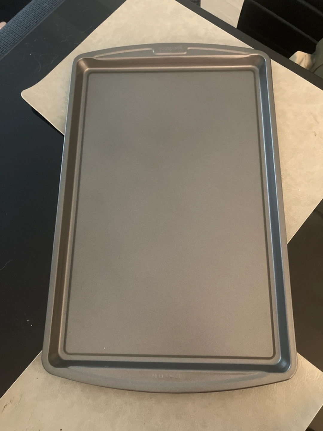 Large, rectangular baking sheet. Non-stick surface. Great for cookies, roasting vegetables, etc. I never had the chance to use it because it doesn’t fit in my oven.