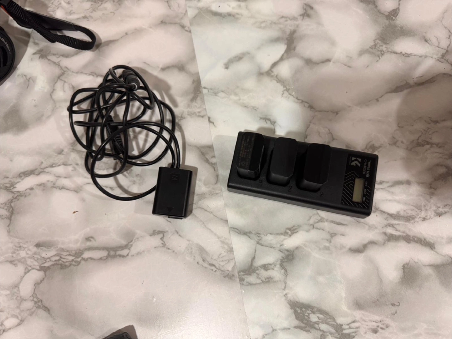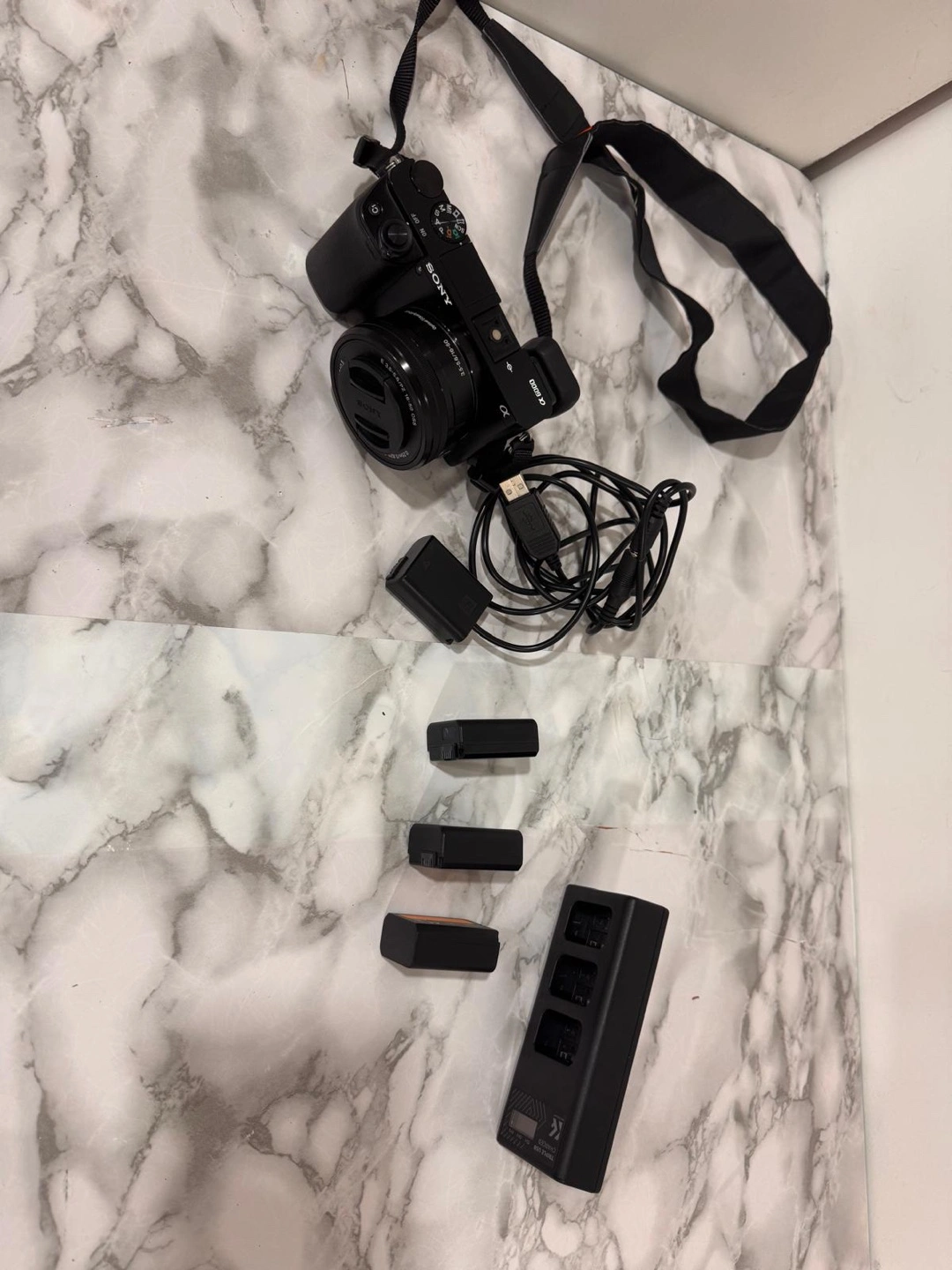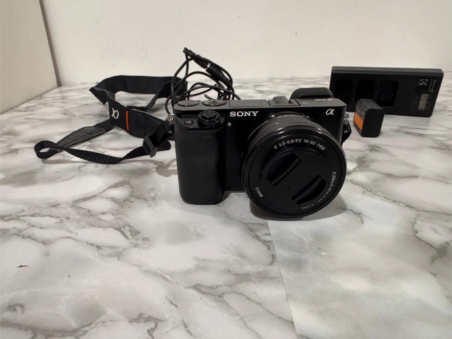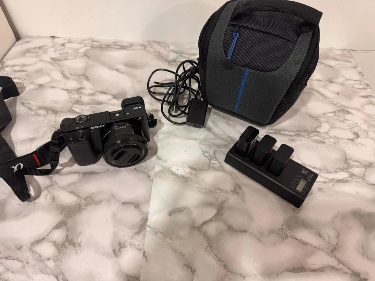 Sony Alpha ILCE-6000 mirrorless camera. Includes lens, extra batteries, battery charger, USB cable, and camera strap. Low shutter count of 4075. Camera bag also included.