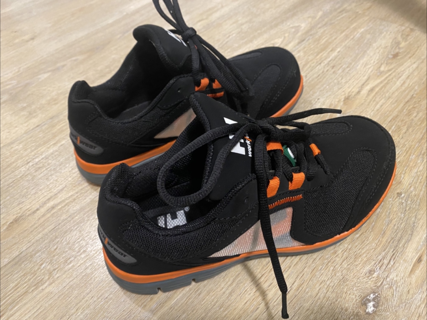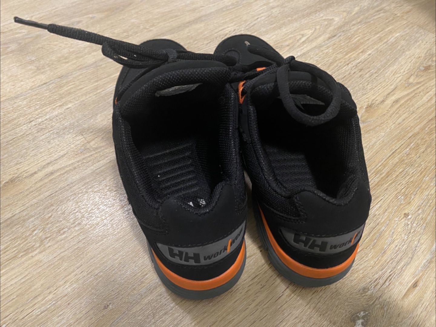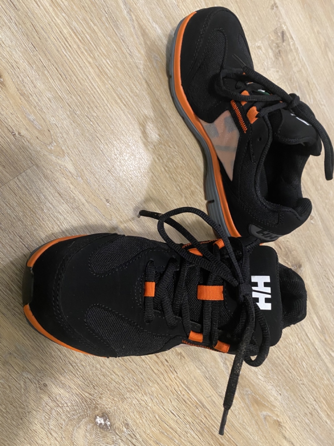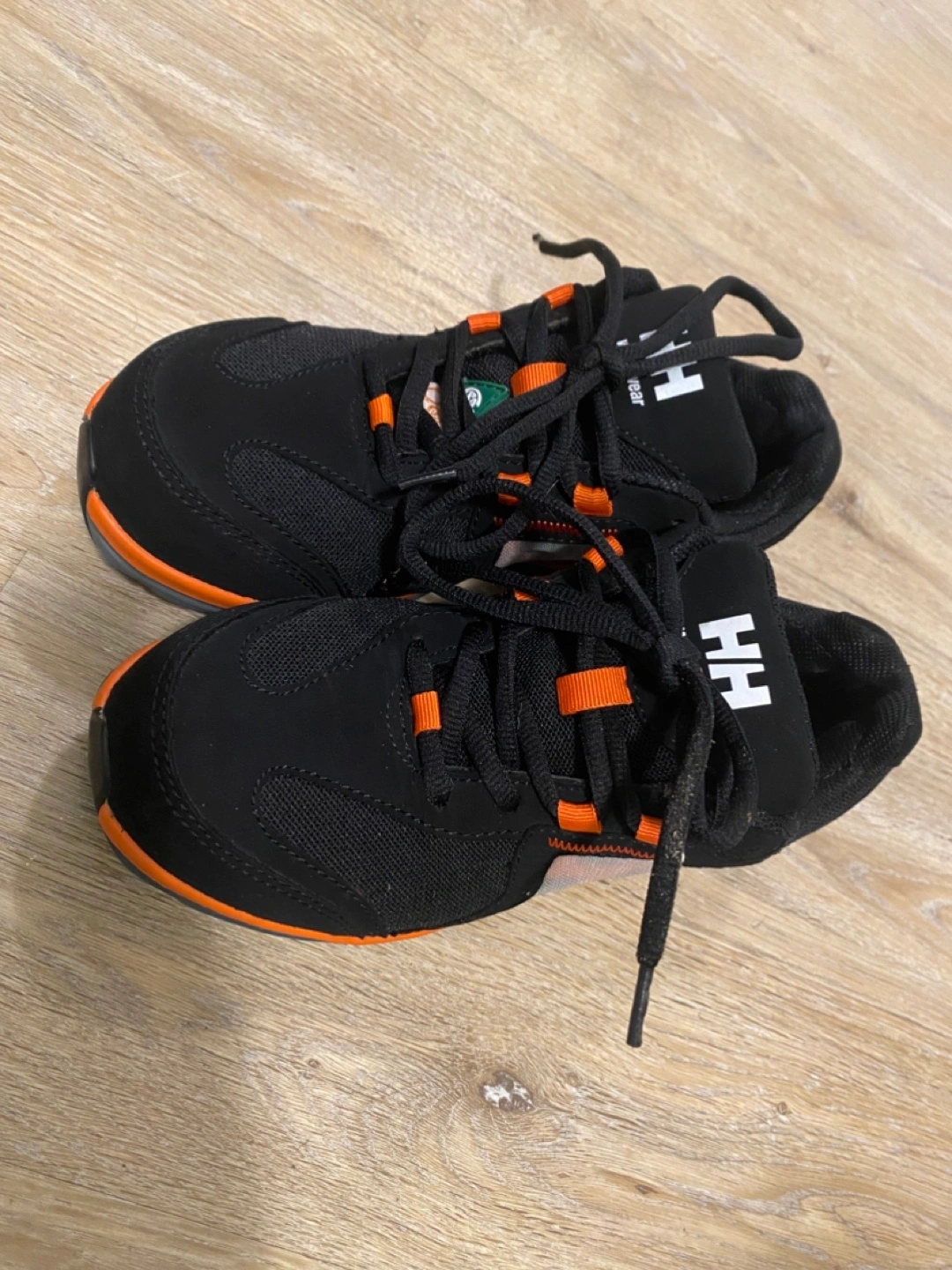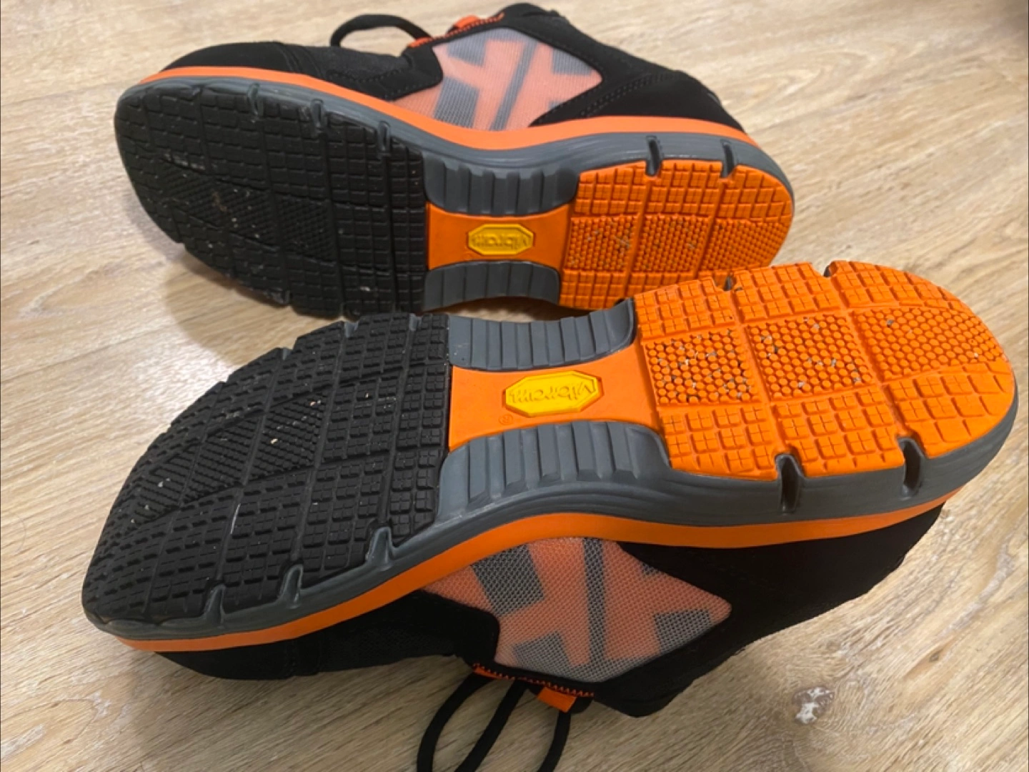 Pair of black and orange safety shoes. Lace-up closure. Vibram soles. Good condition.