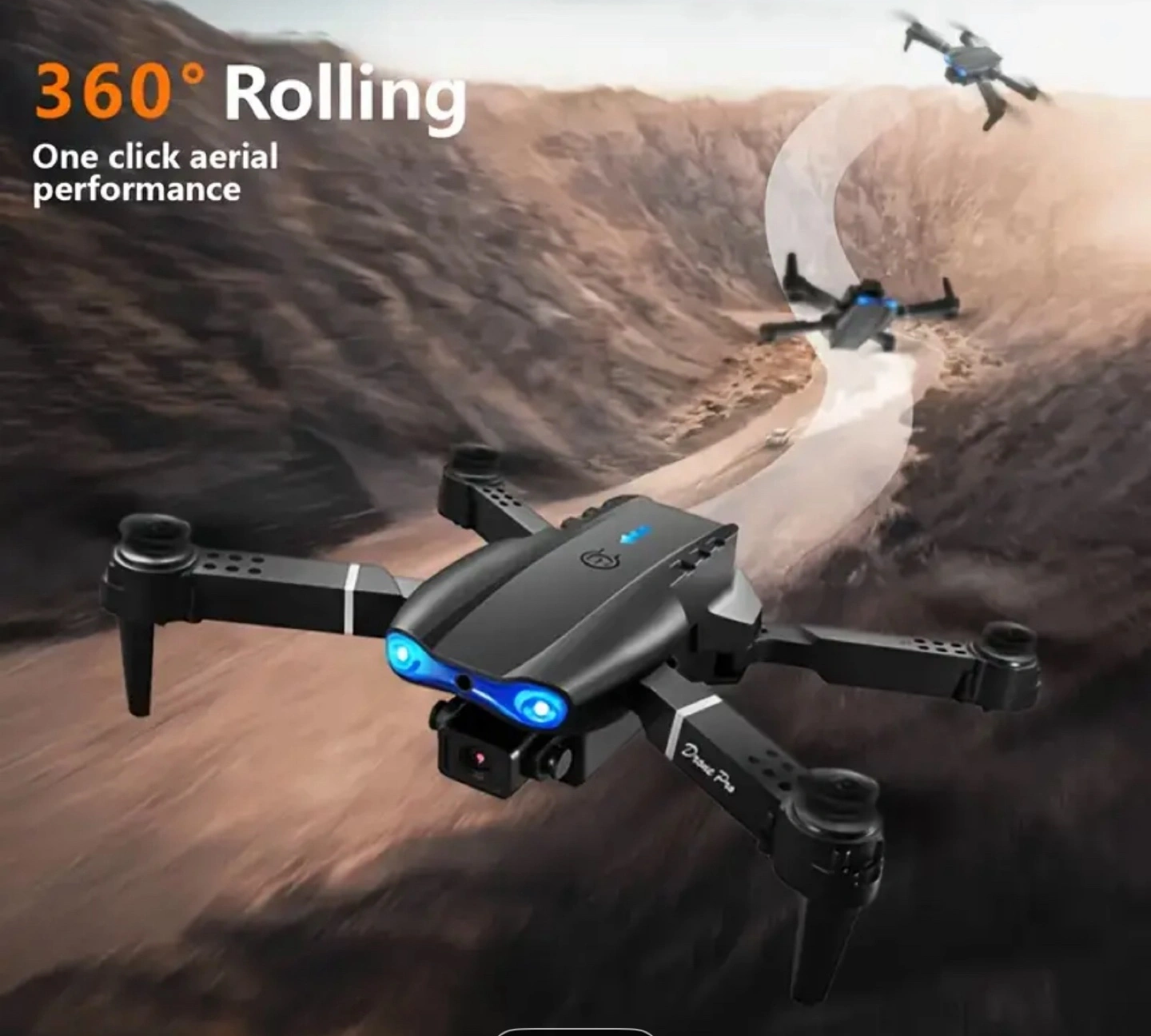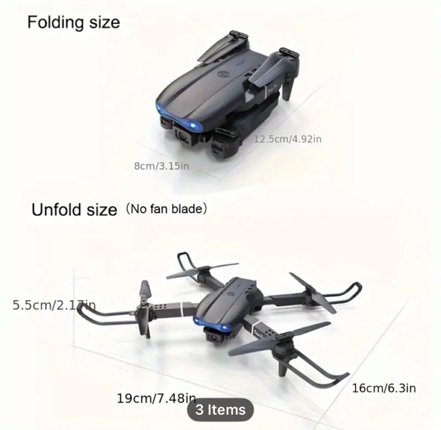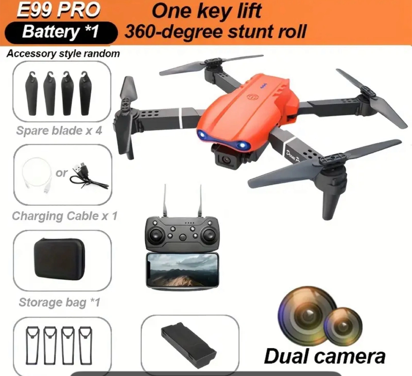 110Foldable drone. Includes dual camera, remote control, extra blades, charging cable and carrying case. One key lift, 360-degree stunt roll. Headless mode, return home function.