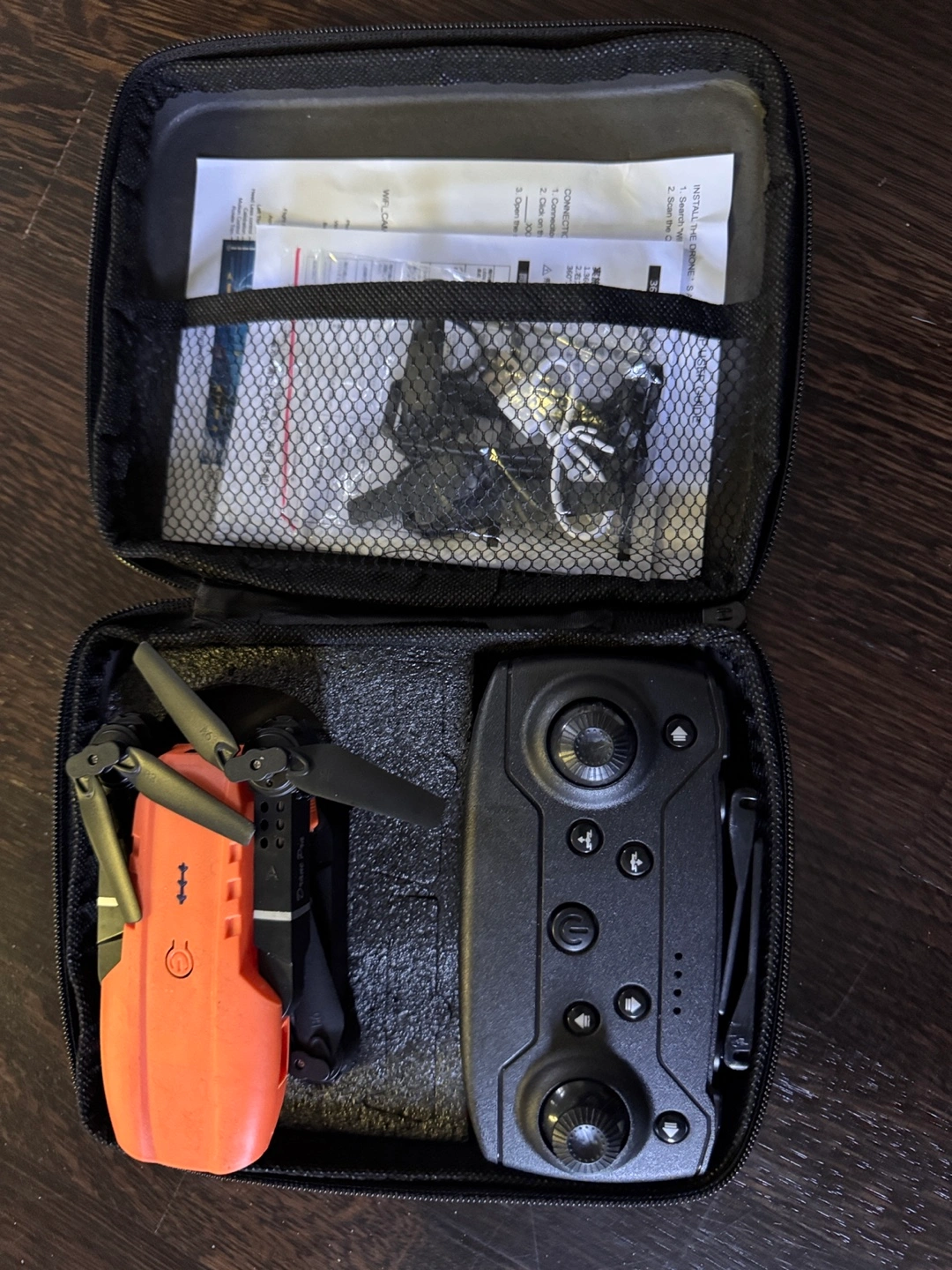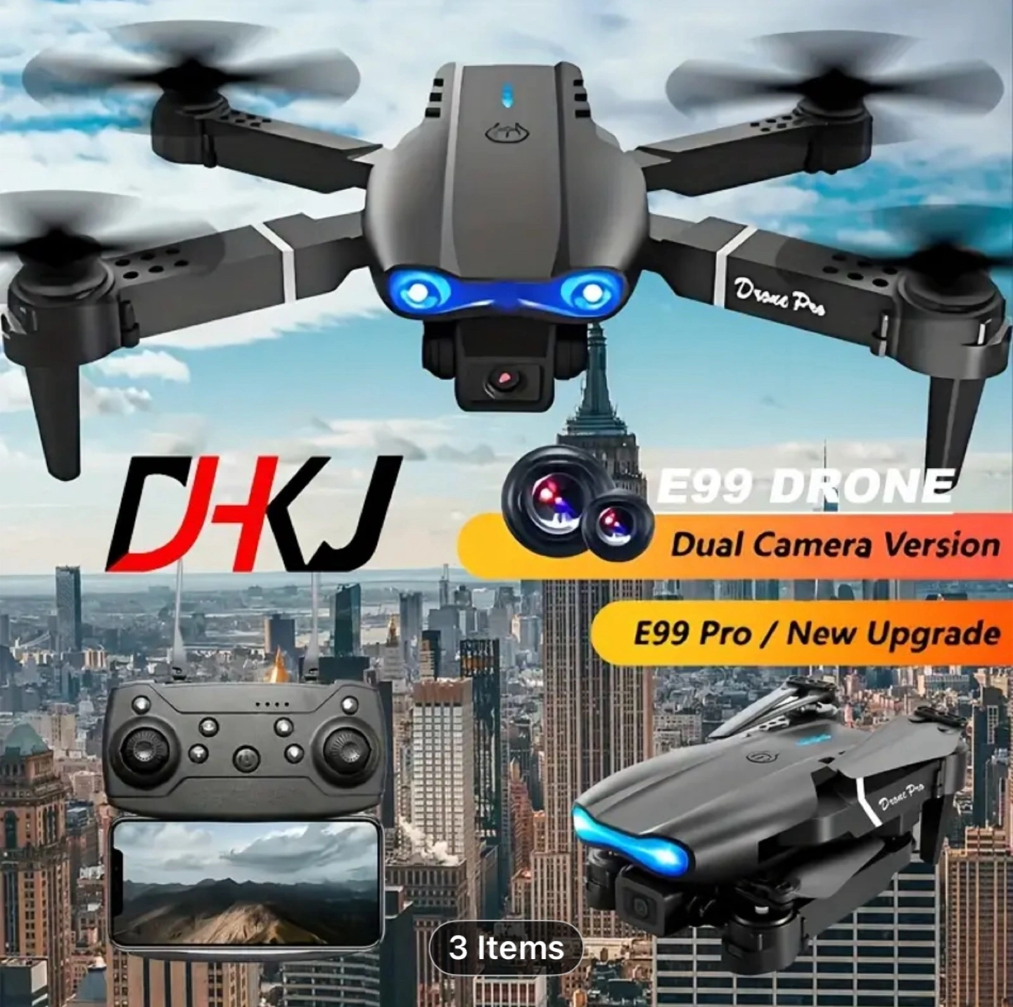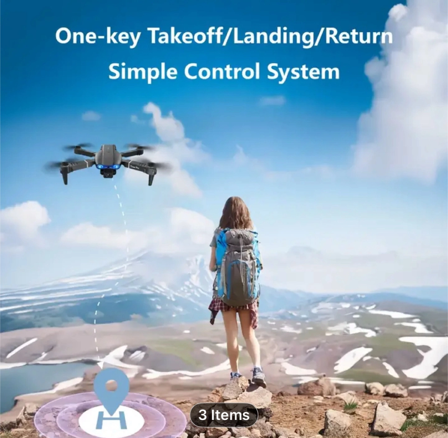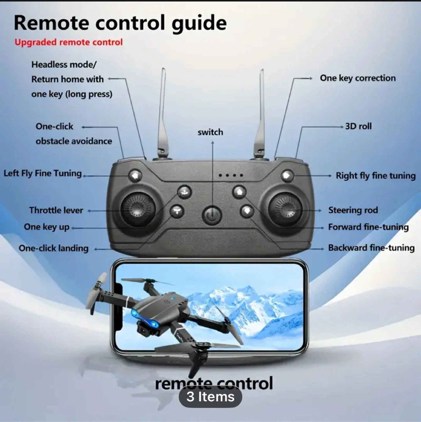 110Foldable drone. Includes dual camera, remote control, extra blades, charging cable and carrying case. One key lift, 360-degree stunt roll. Headless mode, return home function.