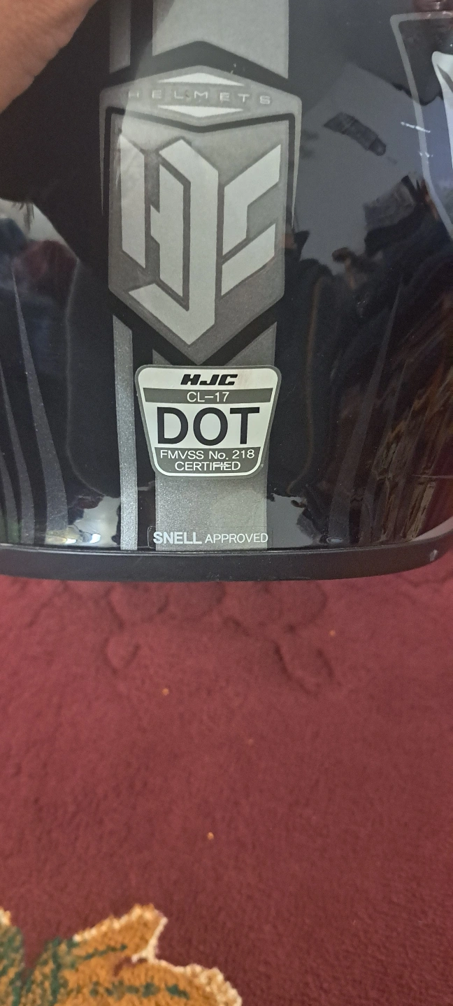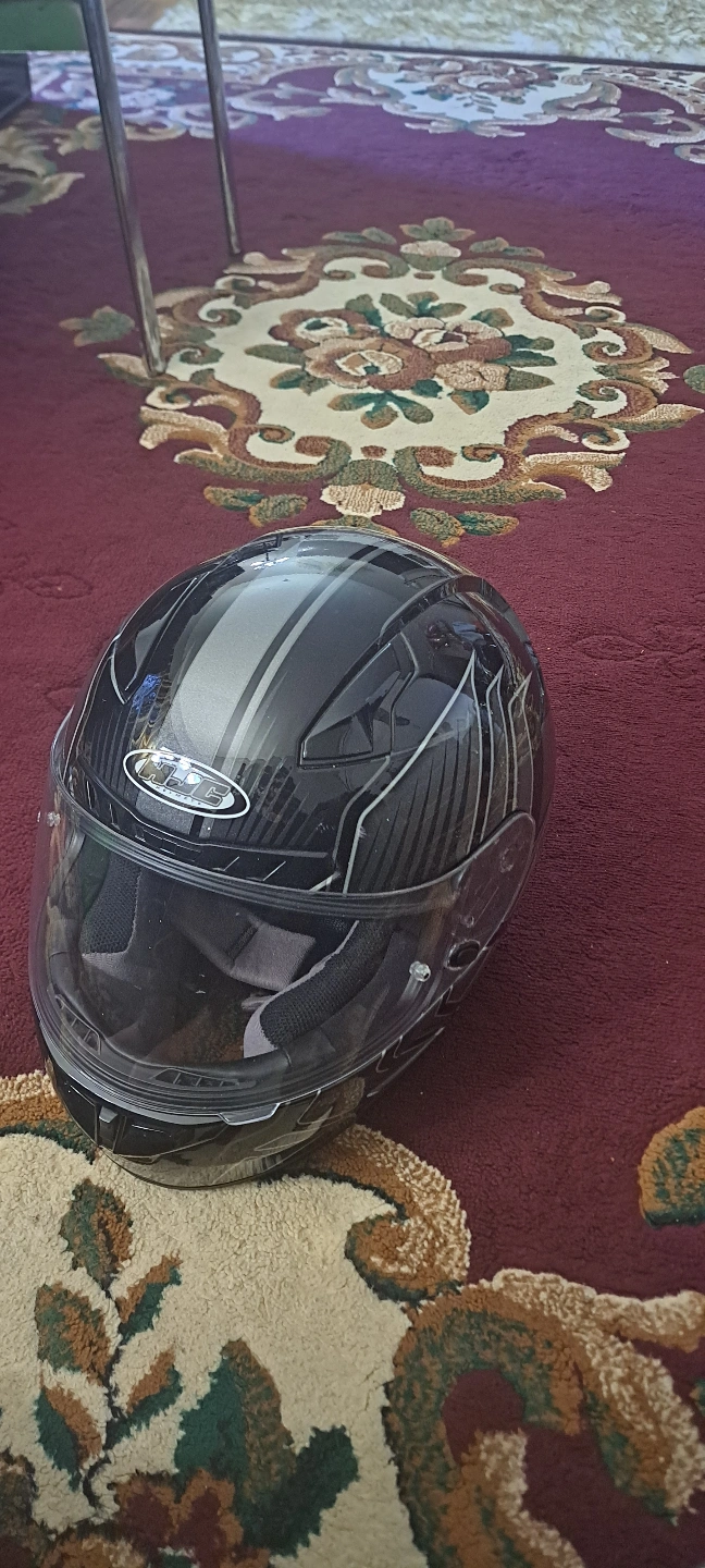 10Black and silver motorcycle helmet. DOT and Snell approved. Features a clear face shield. Used condition. only one time