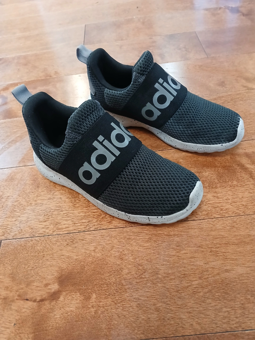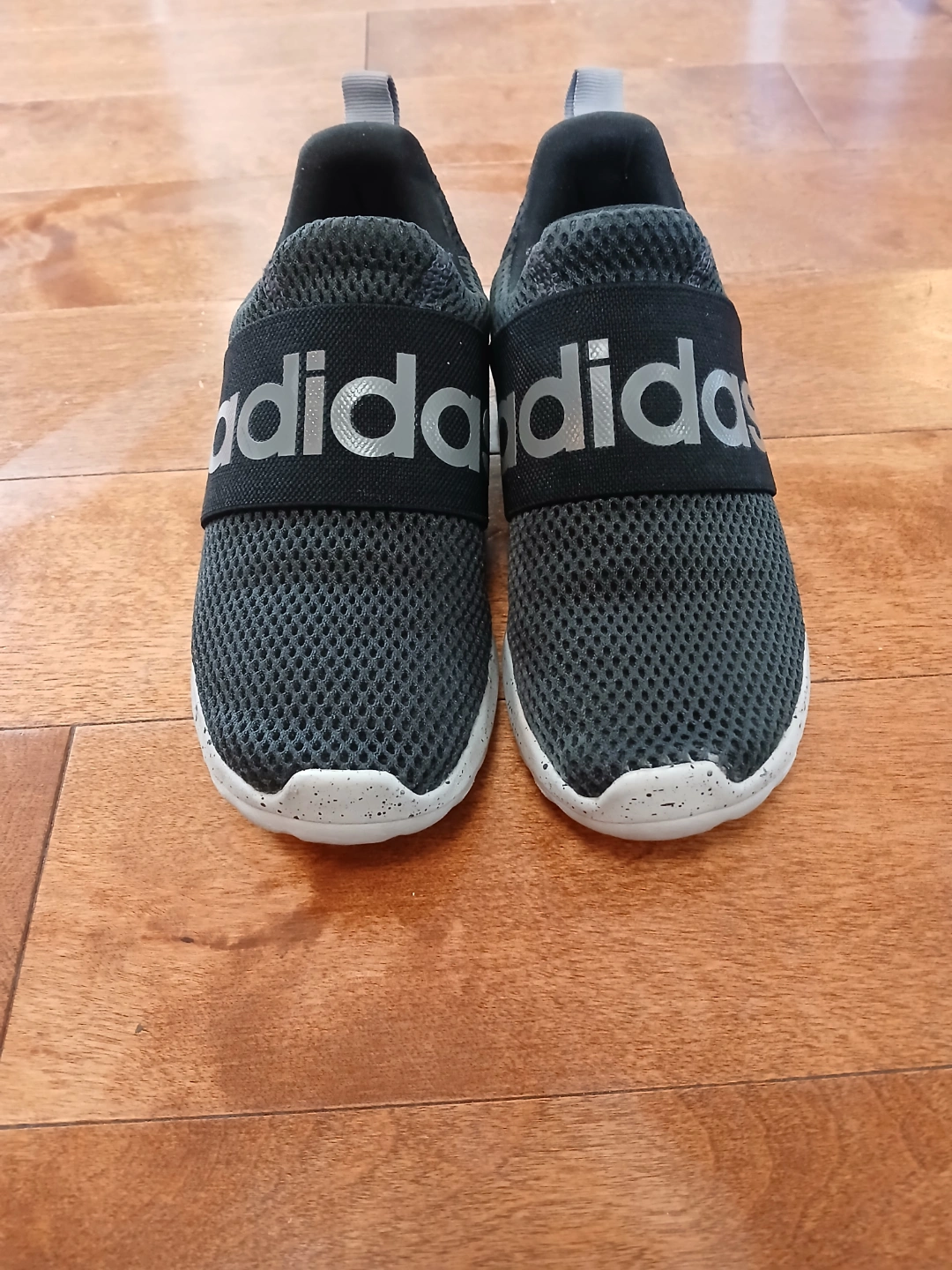 Black mesh Adidas slip-on sneakers. Grey accents. Size 1 kids . Only worn on a few occasions mostly indoors- excellent condition