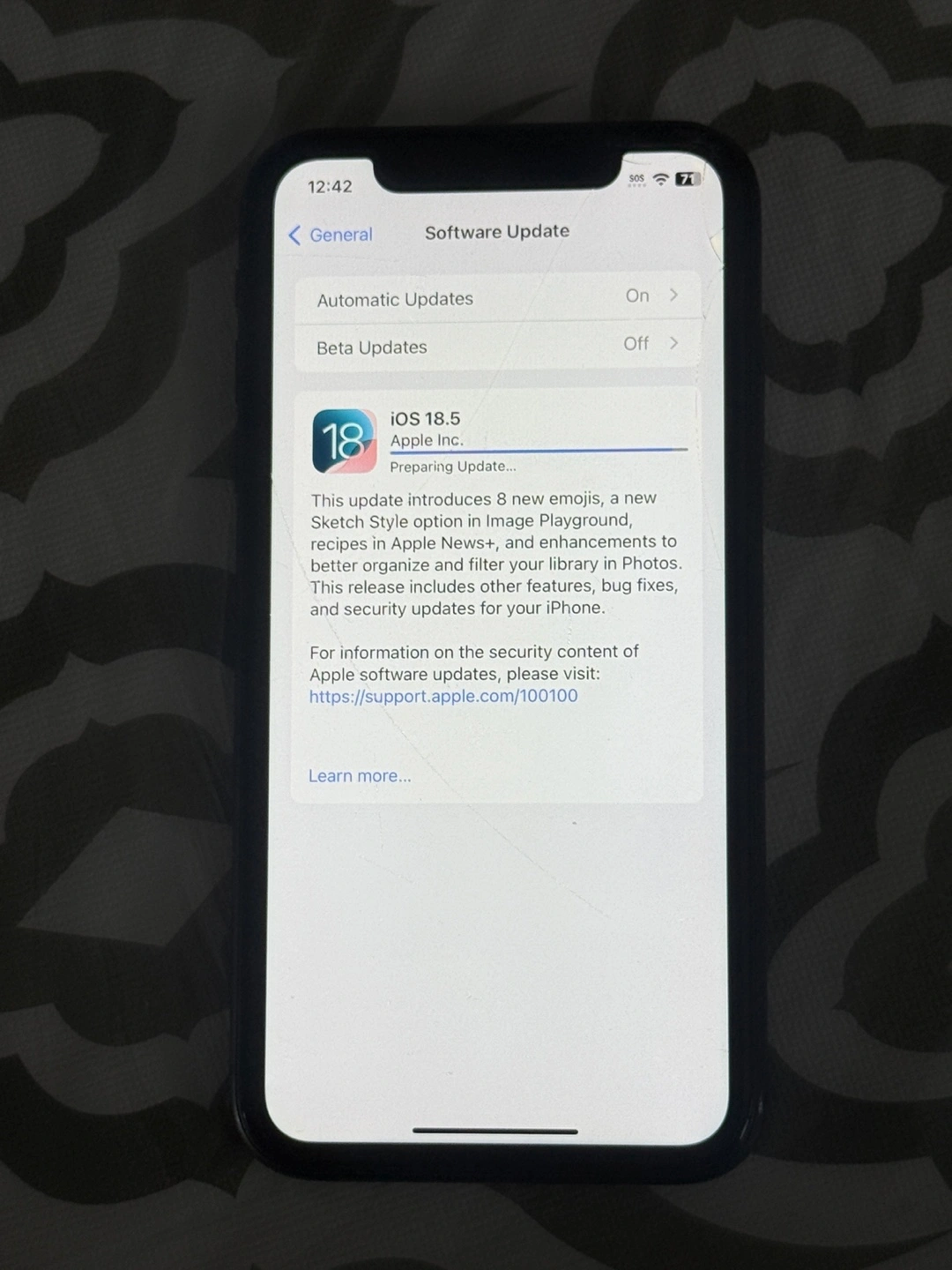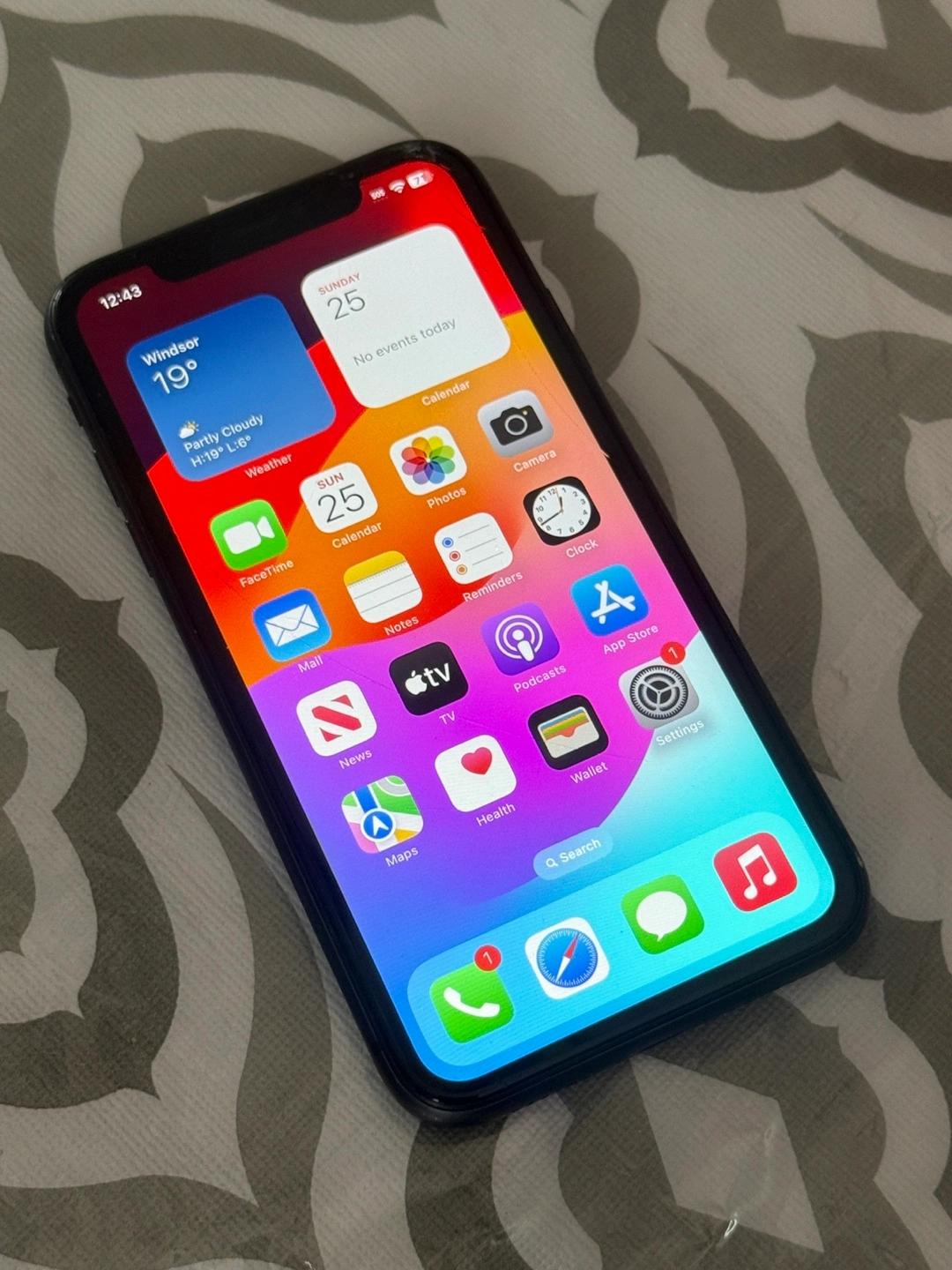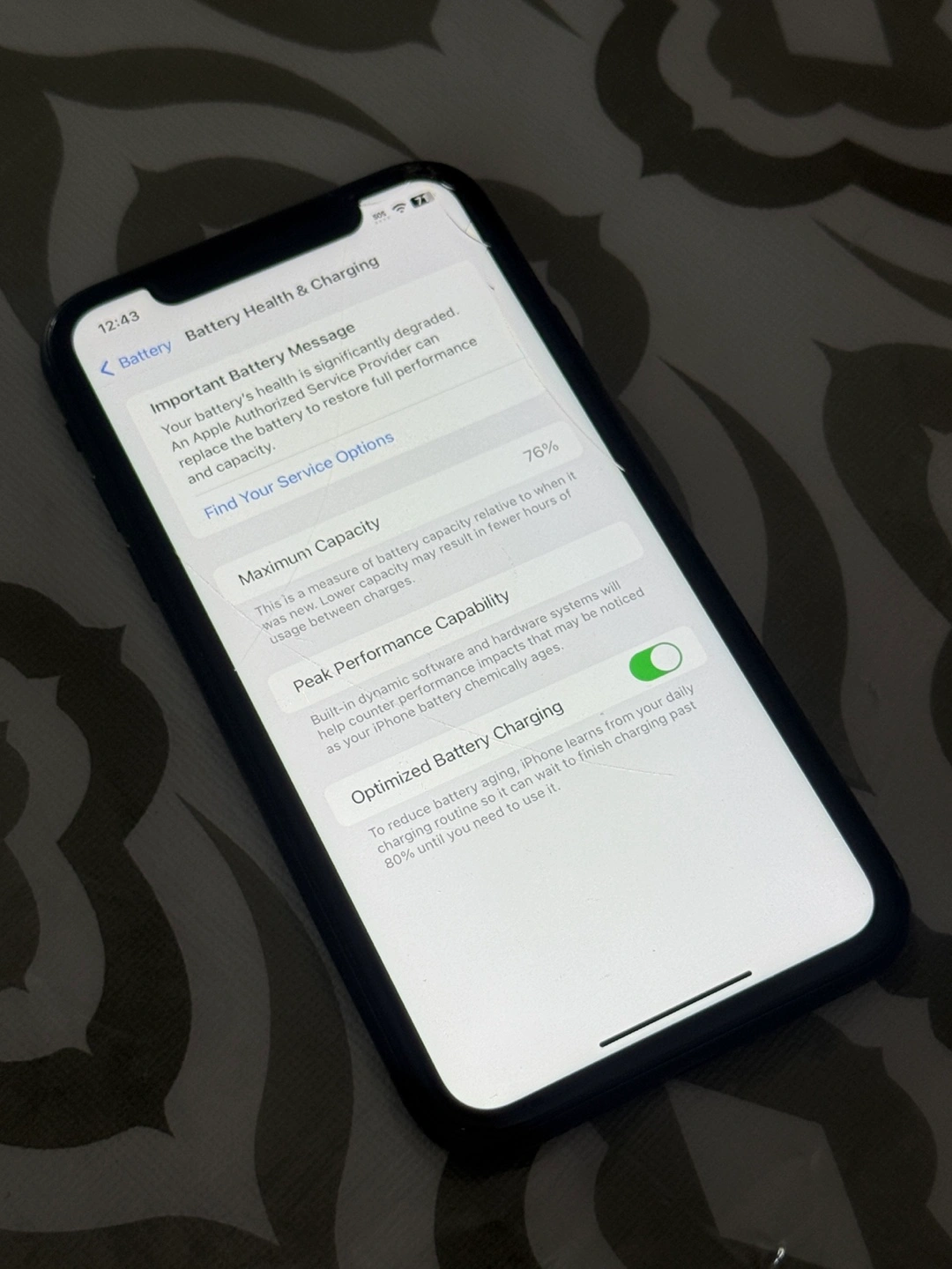 Phone works great no issues other than the fact it has a crack on the top right of display glass. Not very noticeable but you can see the cracks on the top right of the phone. While here is also a long scratch in the middle of the screen Battery health is 76% and storage is 128GB