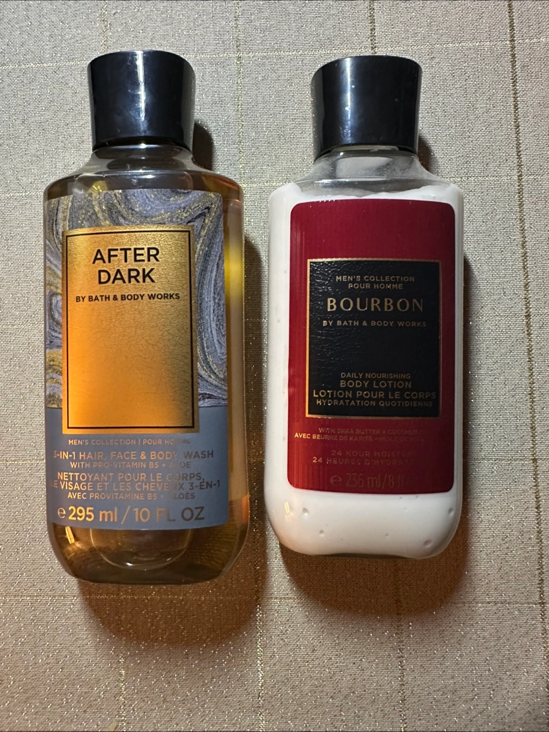 *New* Bath & Body Works men's collection. After Dark 3-in-1 hair, face & body wash and Bourbon daily nourishing body lotion. Both are 295ml/10 fl oz.