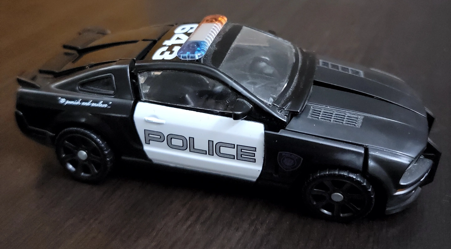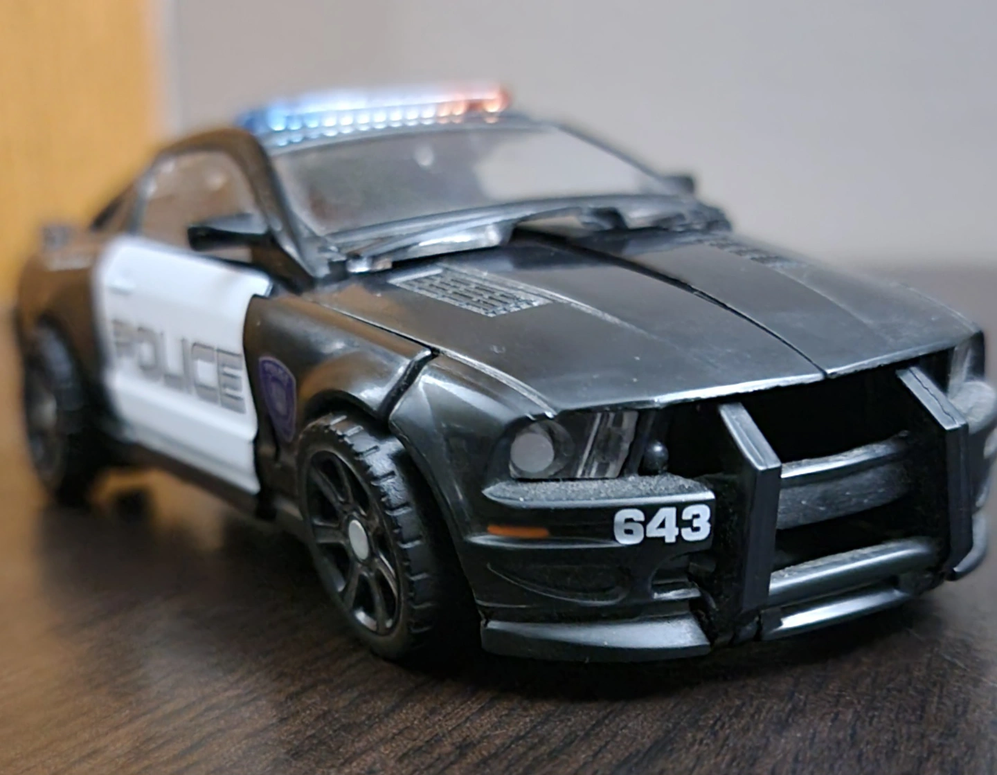 Black and white 643 Police Car Decepticon. Number 643 on top side and on front. Has flashing lights. Collectible toy. Looks like from the movie.