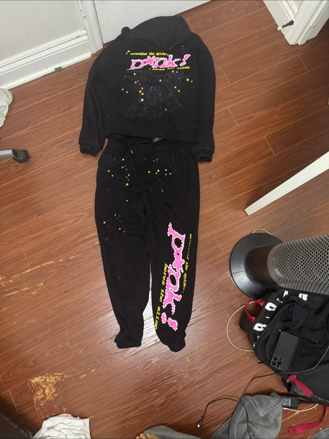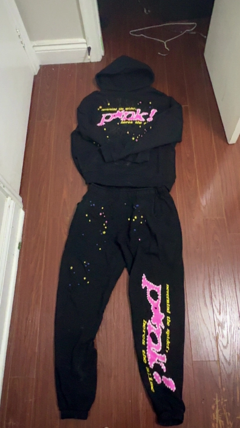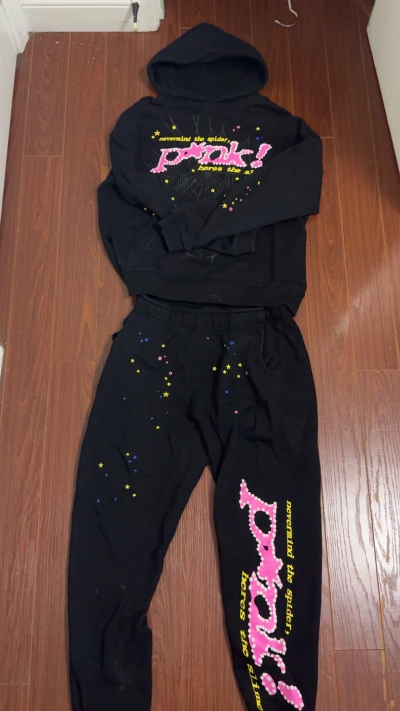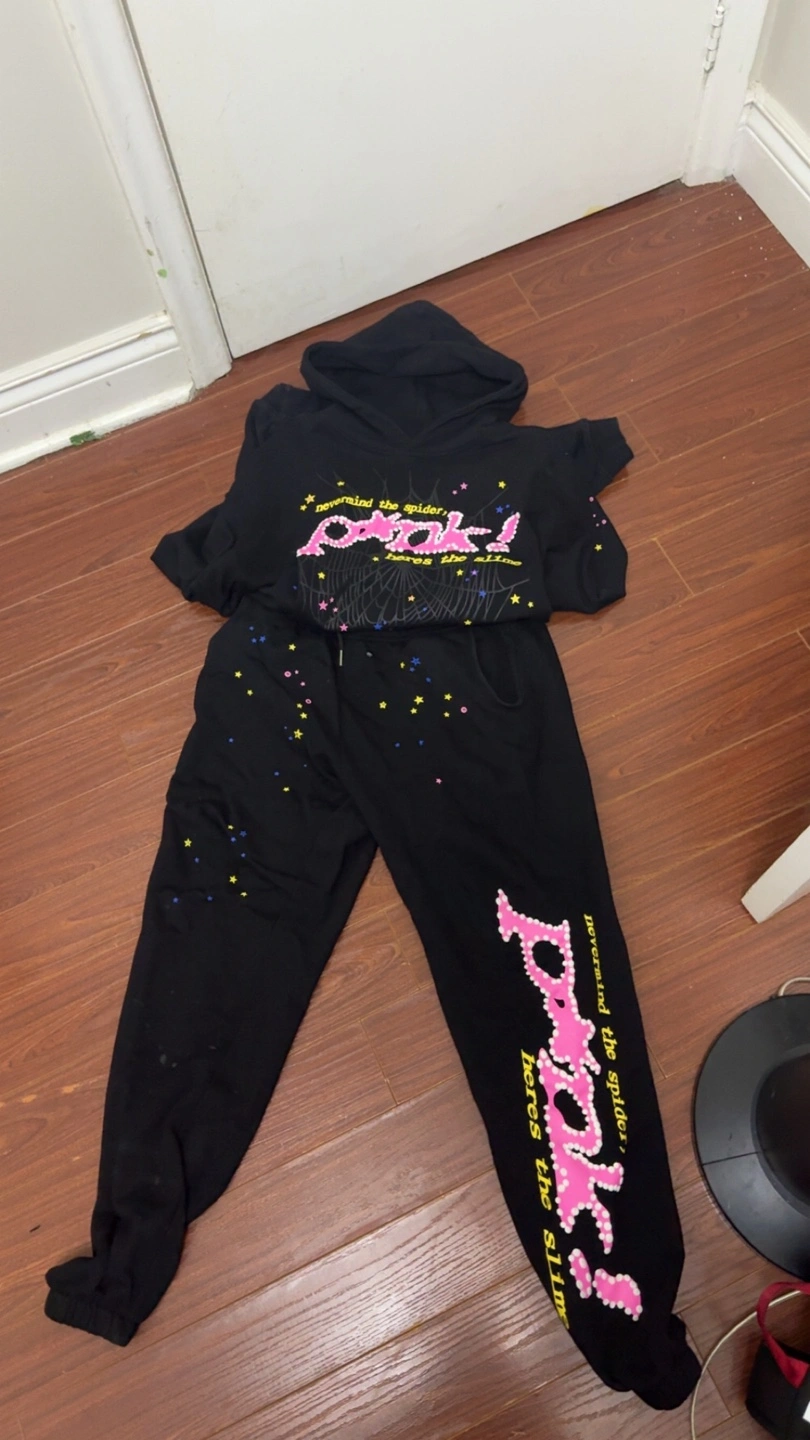 Black Panic! At The Disco hoodie and joggers set. Features band logo and graphic design. Excellent for concerts or casual wear.
