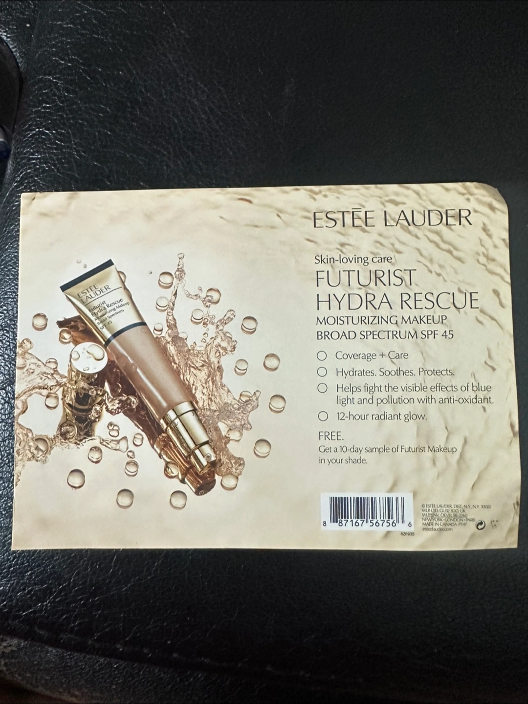 Estee Lauder Futurist Hydra Rescue Broad Spectrum Makeup SPF 45 sample. Hydrates, soothes, protects. Includes a free 10-day sample of Futurist Makeup. Shades shown for reference.