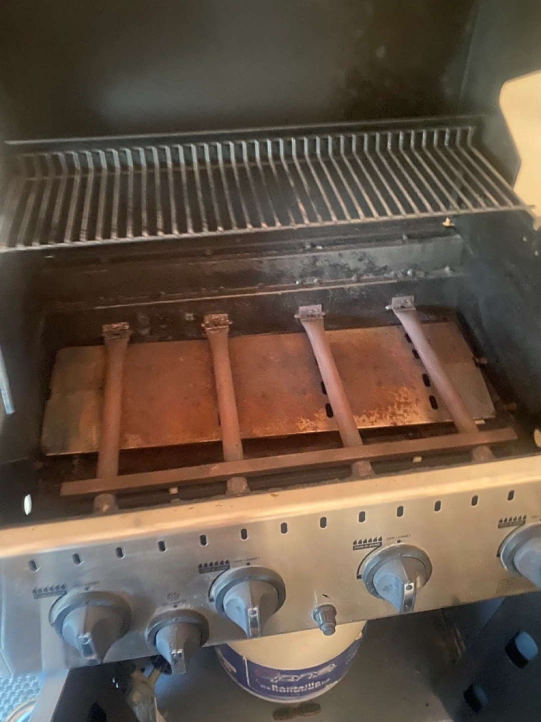 Four burner propane barbecue. Stainless steel exterior. Includes propane tank storage. Shows some signs of use. Comes with a full tank of propane
