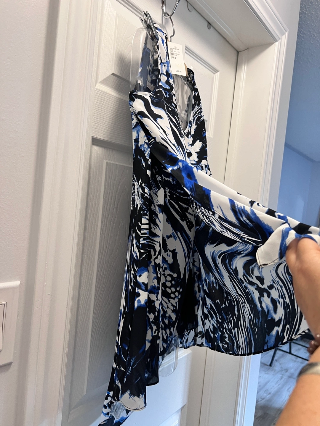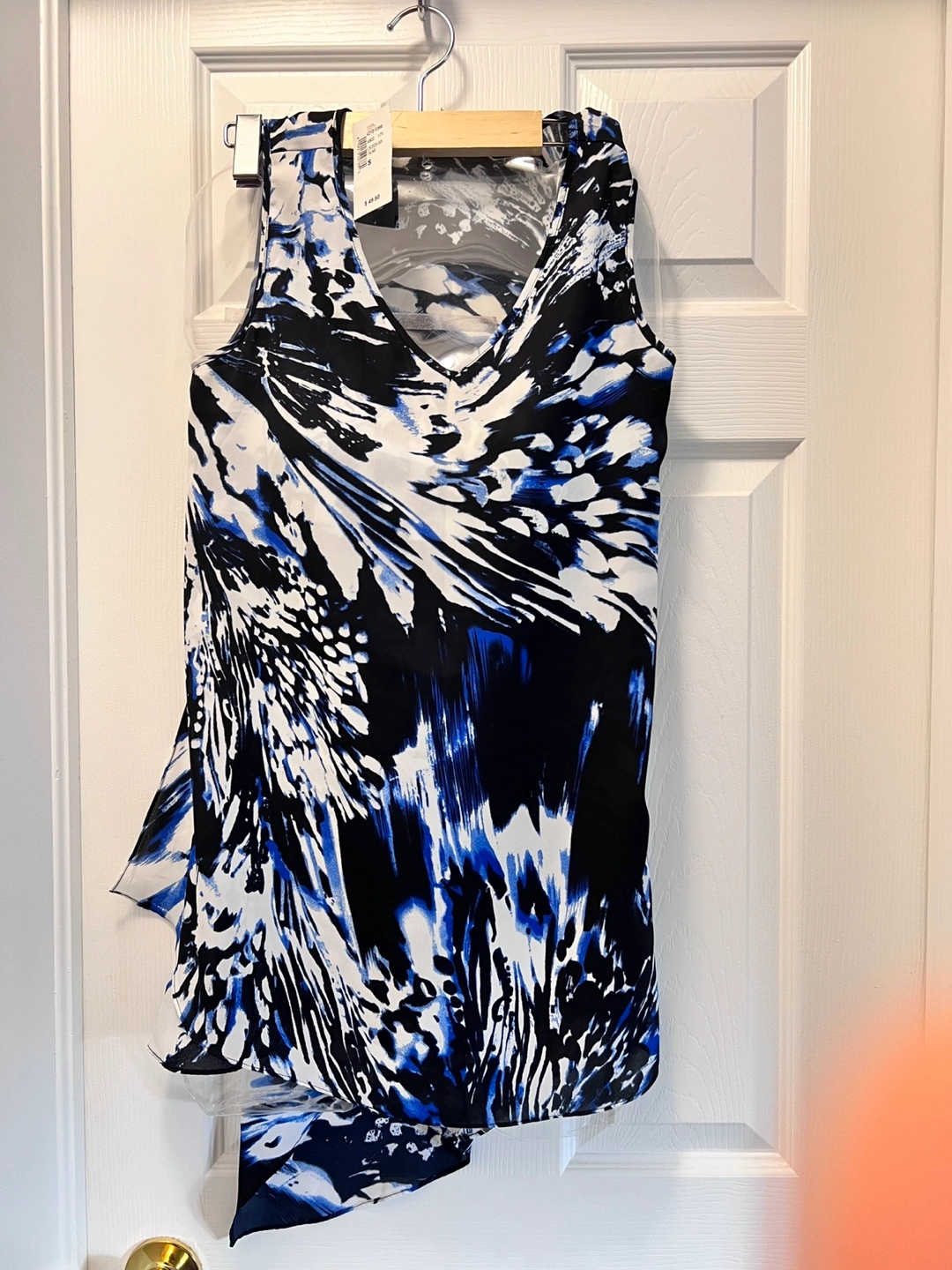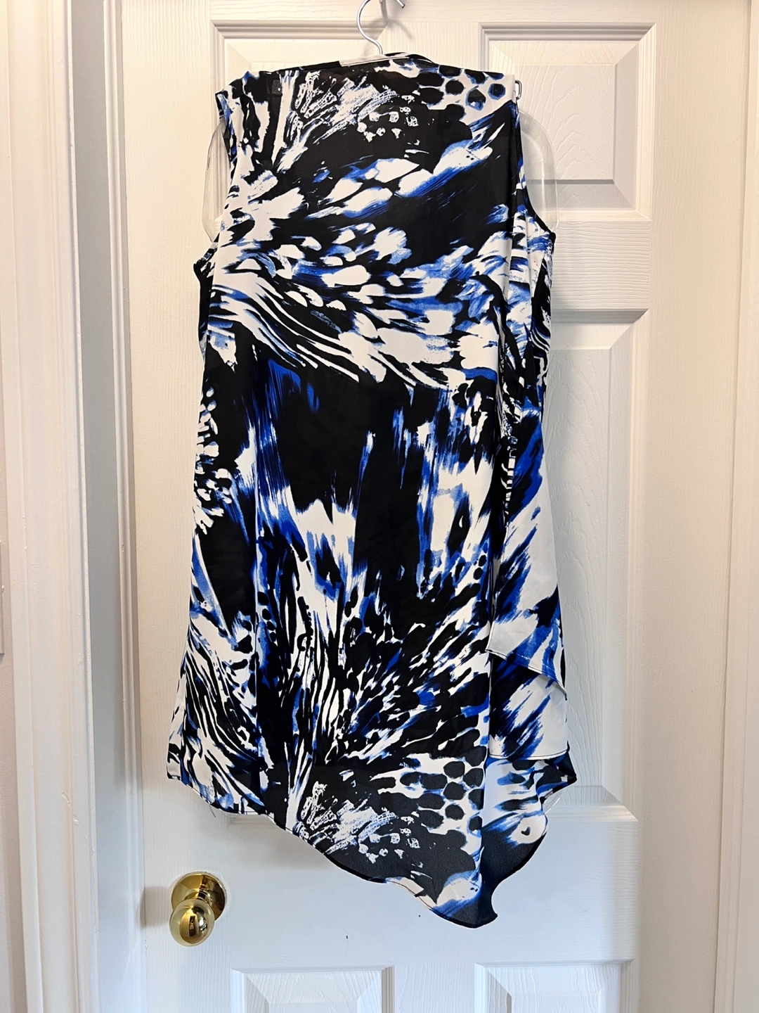 Women's sleeveless blouse. Abstract blue, white, and black print. Asymmetrical hemline. Flowy fabric. Looks great with jeans or dress pants. It’s says small but fit very loose definitely fits like M. cash only. Please check my other posts.