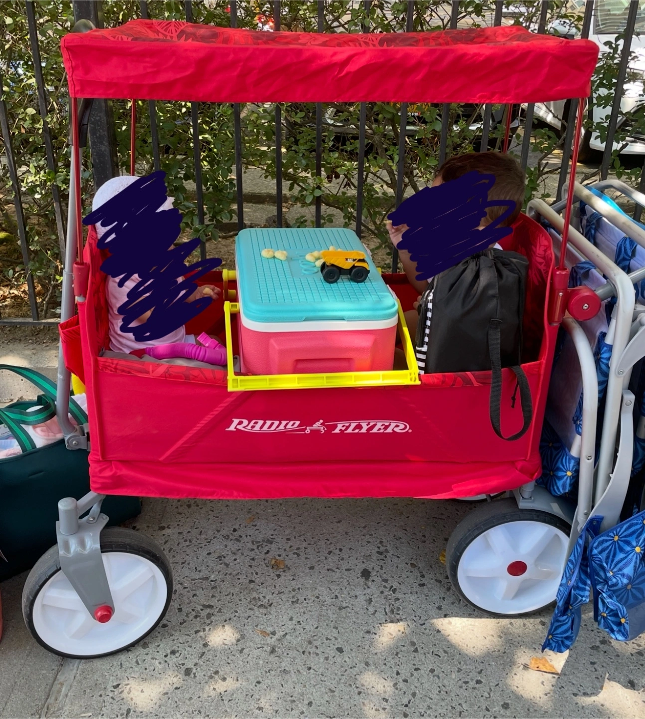 Red wagon, UV protection canopy, folds easily. Great for kids and hauling items. Used but like new. Cooler in photo not included. Suitable for toddlers and kids ages 1.5+ years old. Metal bar for beach chair storage. For the beach and boardwalk