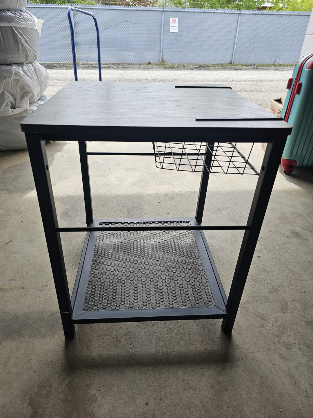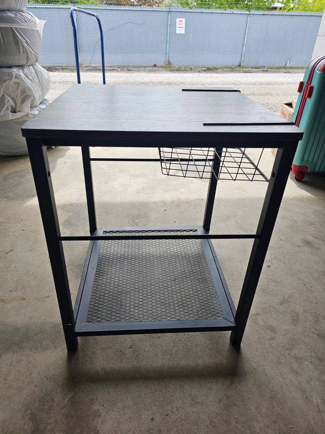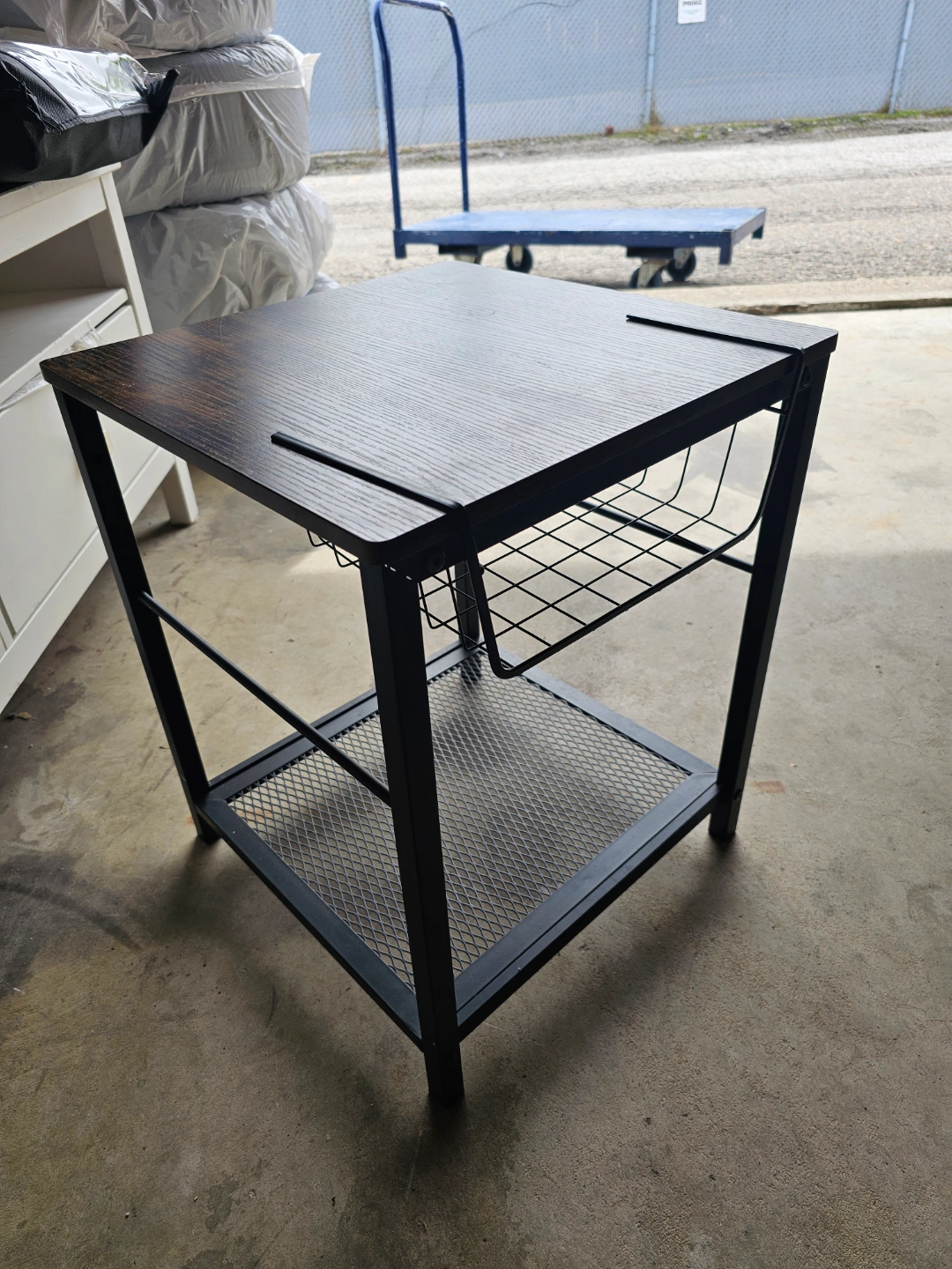 Small square end table. Dark brown wood top. Black metal frame. Lower shelf and wire basket for storage. Great for small spaces.