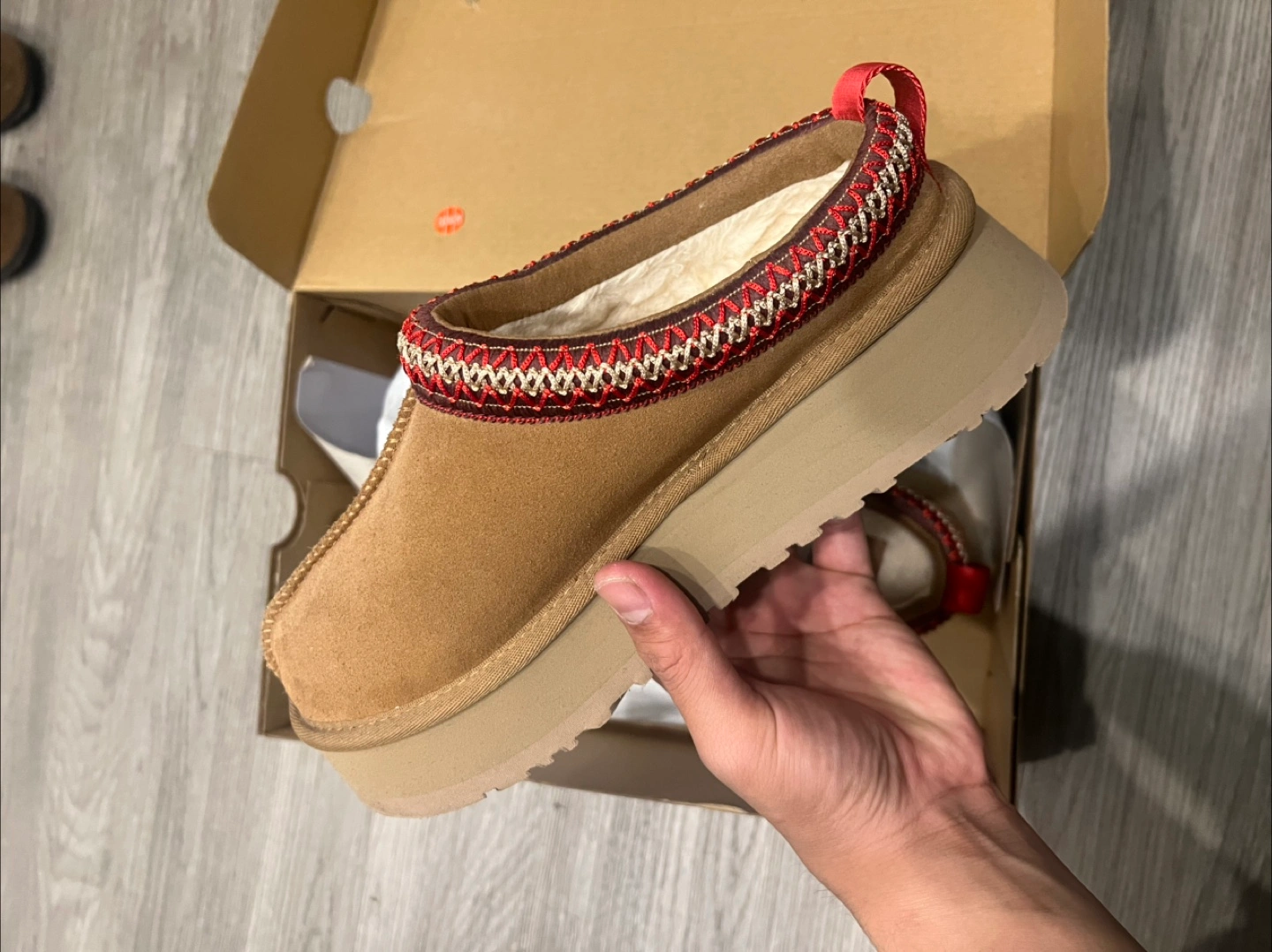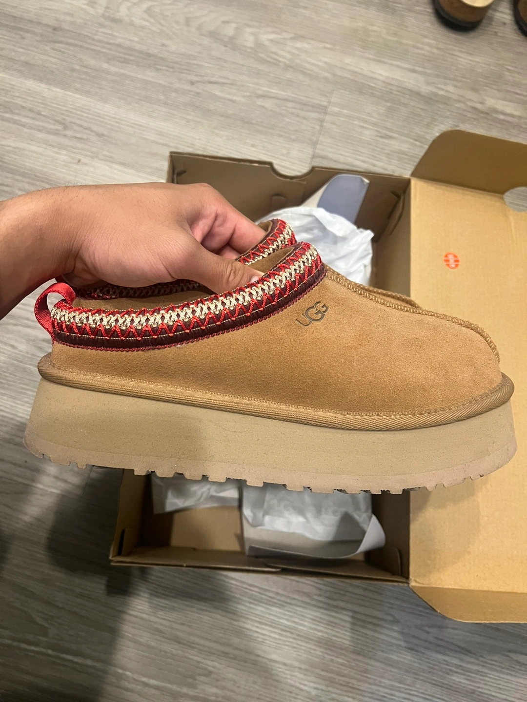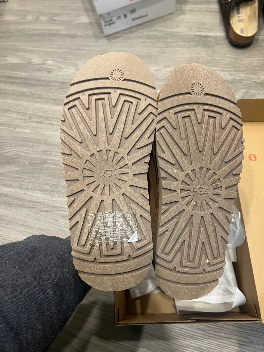 Tan suede with a unique embroidered detail. Cozy shearling lining. Platform sole. Comes in original box.