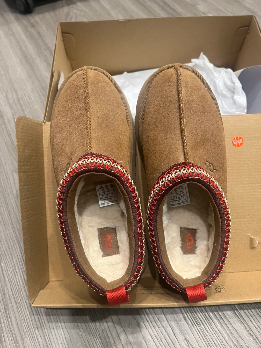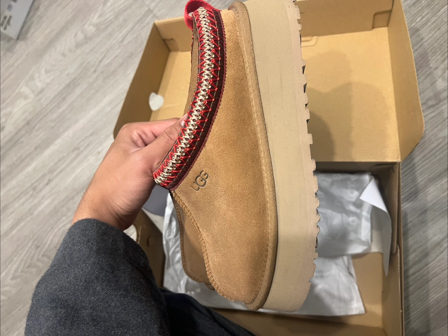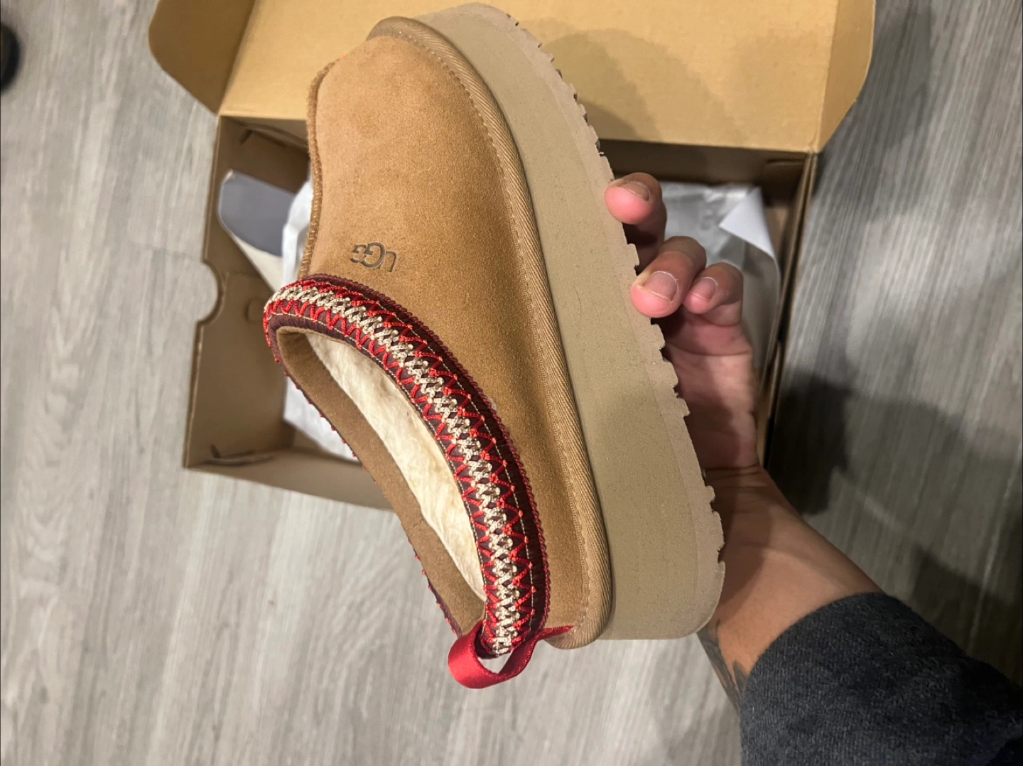 Tan suede with a unique embroidered detail. Cozy shearling lining. Platform sole. Comes in original box.