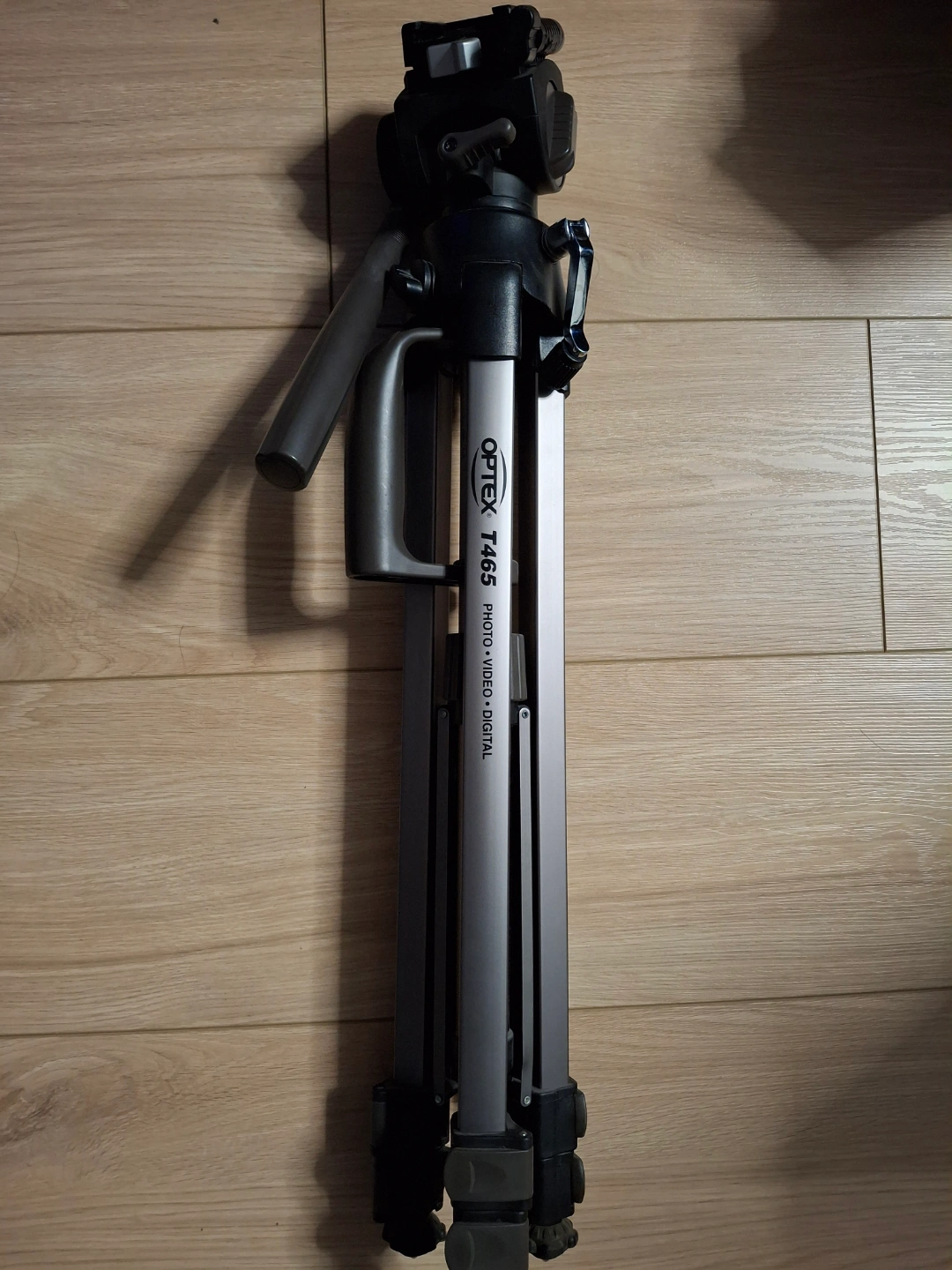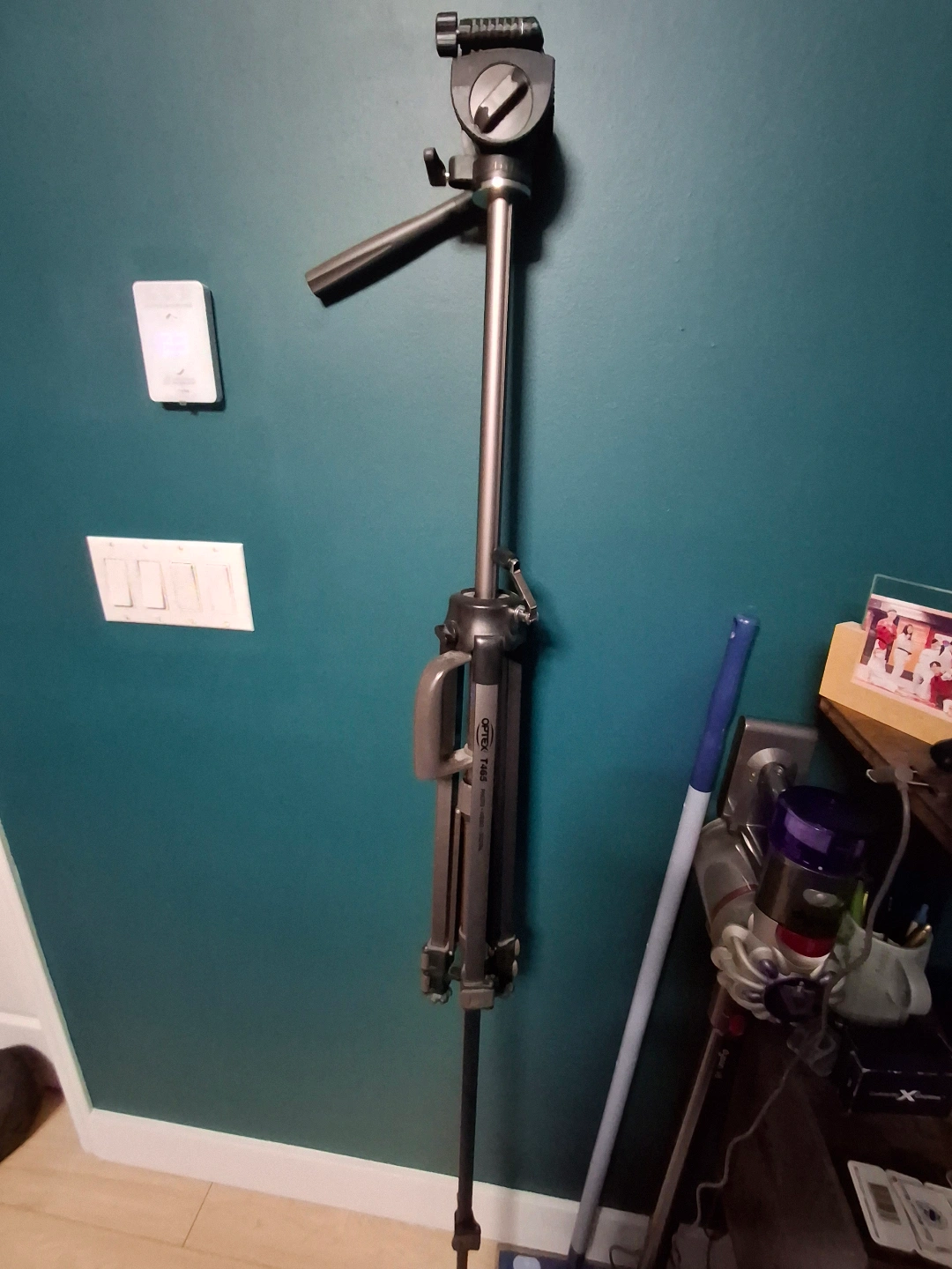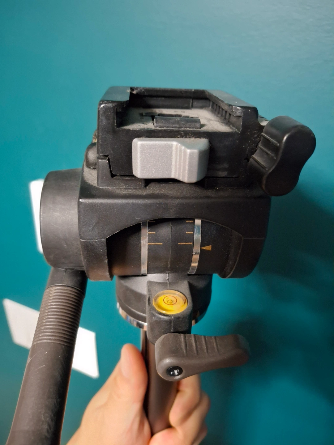 Starts at 25" to 55" with telescopic legs, and finally 65" with the center column. 2 bubble levels and swivel head for panning. Minor wear, but functions fine and smooth.